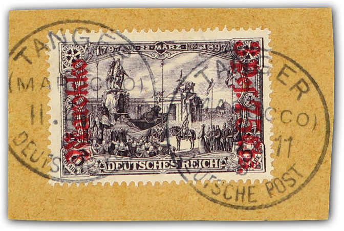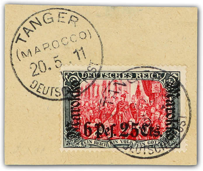 1911, 6 P. 25 C. auf 5 M. Aufdruckausgabe grünschwarz/dunkelkarmin, Friedensdruck, 26:17 Zähnungslöcher, glänzender Aufdruck, glasklar gestempelt "TANGER (MAROCCO) 20.5.11" auf dekorativem Briefstück, farbfrisch und einwandfrei, geprüft