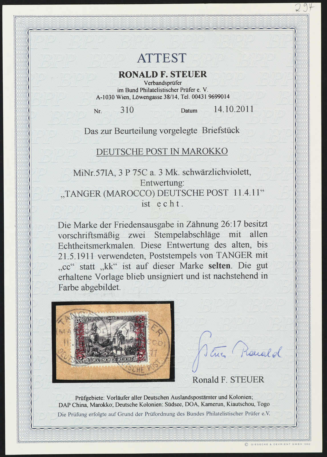1911, 3 P. 75 C. auf 3 M. Aufdruckausgabe schwärzlichviolett, Friedensdruck, 26:17 Zähnungslöcher, glasklar entwertet "TANGER (MAROCCO) DEUTSCHE POST 11.4.11", gute Qualität, Fotoattest Steuer BPP (ME 780,-) (Image) (imagea)