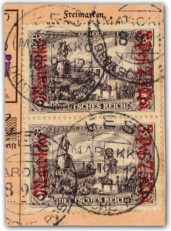 1911, 3 P. 75 C. auf 3 M. schwärzlichviolett, senkrechtes Paar auf PA-Auschnitt, entwertet "FES MAROKKO DEUTSCHE POST 18.9.12", farbfrisch und gut gezähnt, sign. R. Steuer VÖB, einwandfrei (ME 520,-) (Image)