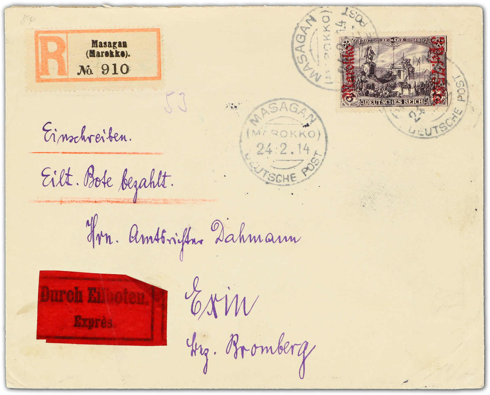 1911, 3 P. 75 C. auf 3 M. Aufdruckausgabe schwärzlichviolett, rotorange quarzend, Friedensdruck, 26:17 Zähnungslöcher, sauber gestempelt "MASAGAN 24 2.14" auf überfrankiertem Eilboten-R-Brief nach Exin mit rückseitigem Ankunftsstempel,