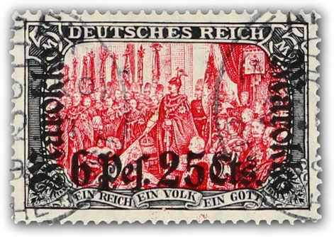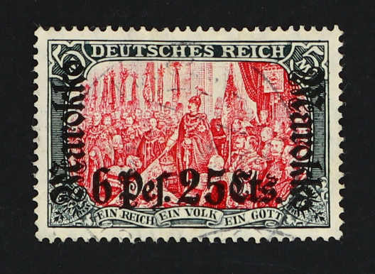 1911. 6 P. 25 C. auf 5 M. Aufdruckausgabe grünschwarz/dunkelkarmin, Friedensdruck, 26:17 Zähnungslöcher, glänzender Aufdruck, gestempelt, einwandfrei, signiert, Fotobefund Jäschke-Lantelme BPP (ME 420,-) (Image) (imagea)