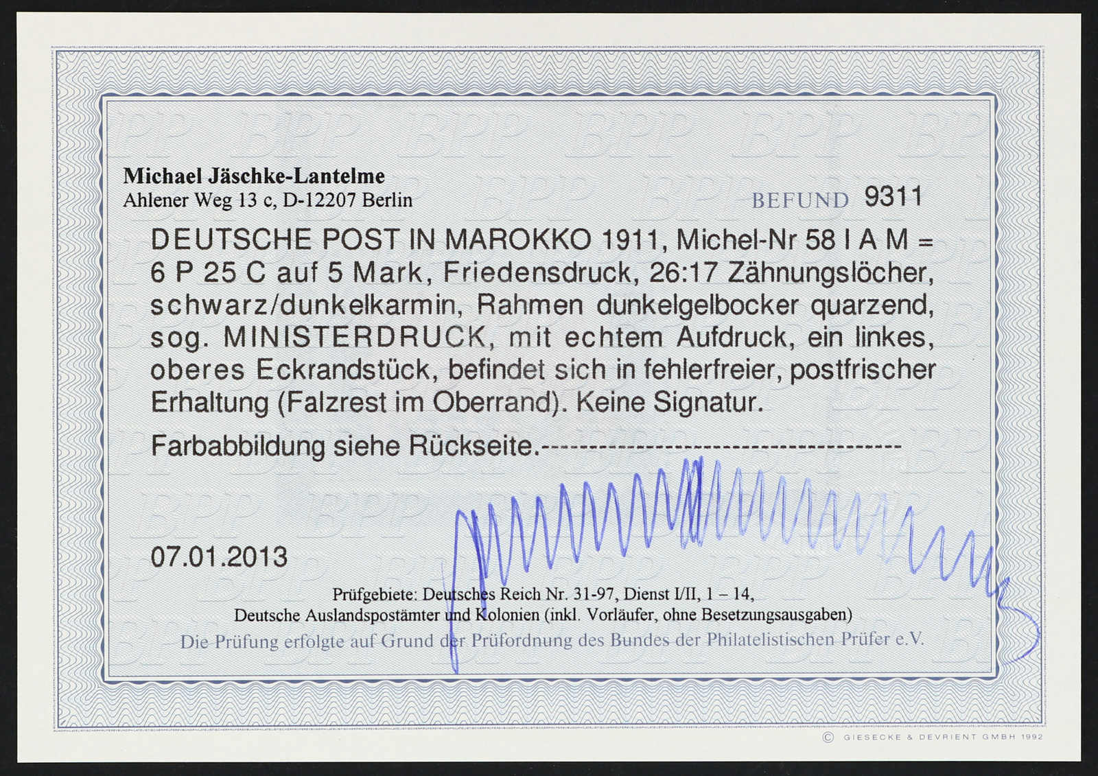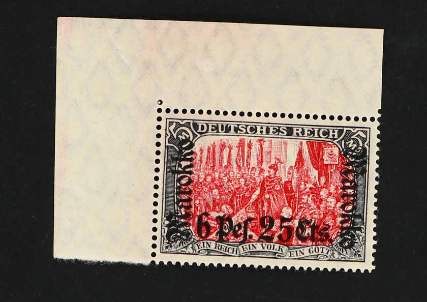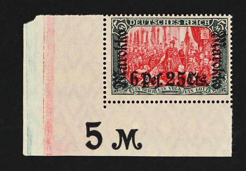 1911, 6 P. 25 C. auf 5 M. Aufdruckausgabe schwarz/dunkelkarmin, Rahmen dunkelgelbocker quarzend, Friedensdruck, 26:17 Zähnungslöcher, sog. Ministerdruck, postfrisches Exemplar aus der oberen linken Bogenecke, Falzrest im Oberrand,