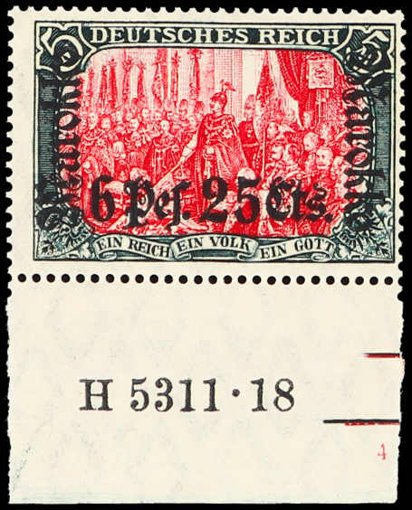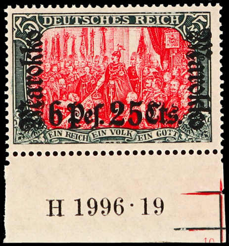 1911, 6 P. 25 C. auf 5 M. Aufdruckausgabe grünschwarz/dunkelkarmin, Friedensdruck, 26:17 Zähnungslöcher, rußiger Aufdruck, postfrisches Exemplar vom Unterrand mit Aufdruck-HAN 5311.18 und Formnummer "4", farbfrisch, einwandfrei, Zähnung