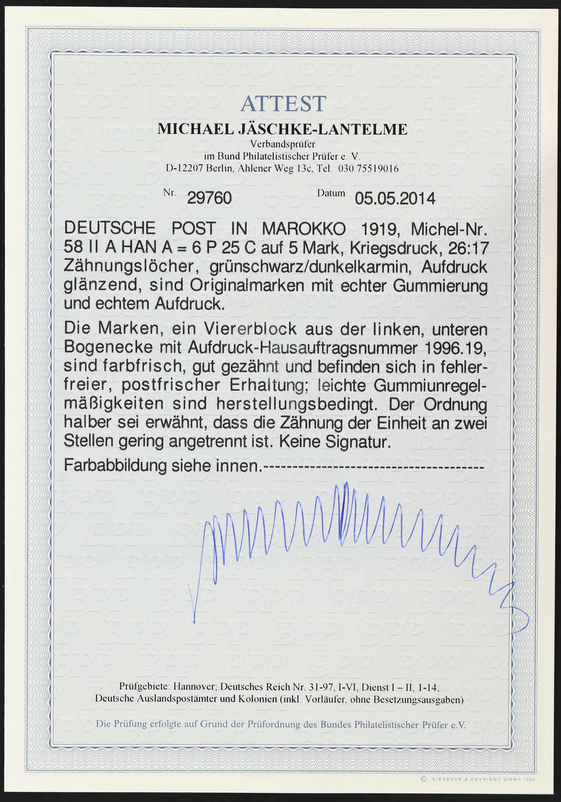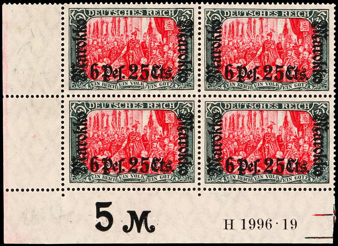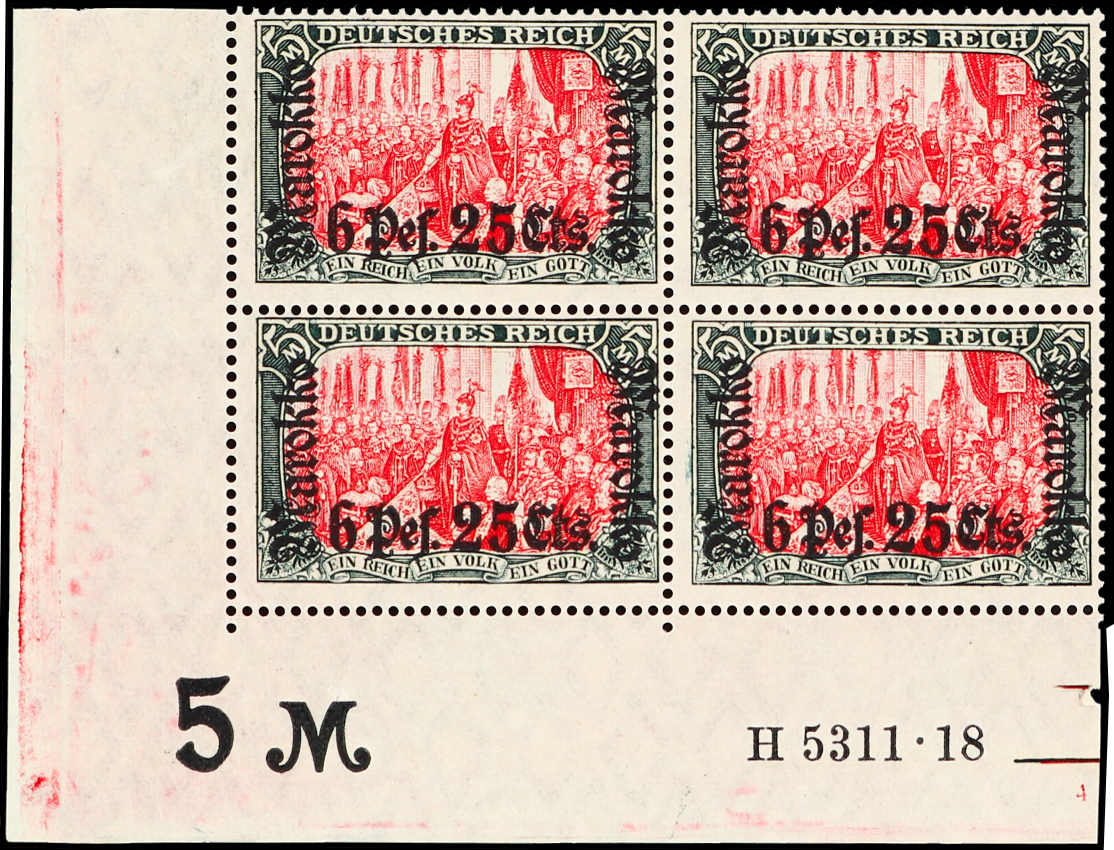 1918, 6 P. 25 C. auf 5 M. Kriegsdruck grünschwarz/dunkelkarmin, postfrischer 4er-Block aus der unteren linken Bogenecke mit der Aufdruck-HAN H 5311.18, farbfrisch, ungefaltet und gut gezähnt, einwandfrei (ME 680,-) (Image)