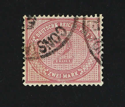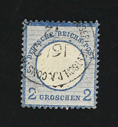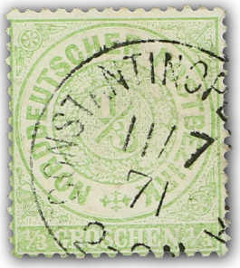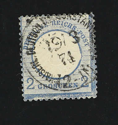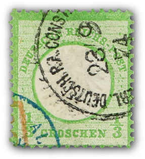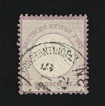 1872, 2 Gr. (grau)ultramarin mit Plattenfehler "Beule im Innenkreis unter T von POST", gestempelt "KAISERL.DEUTSCH.P.A.CONSTANT(INOPEL) 19/3 74", farbfrisch, eine vermeintlich punkthelle Stelle ist herstellungsbedingt (ausgewaschenes