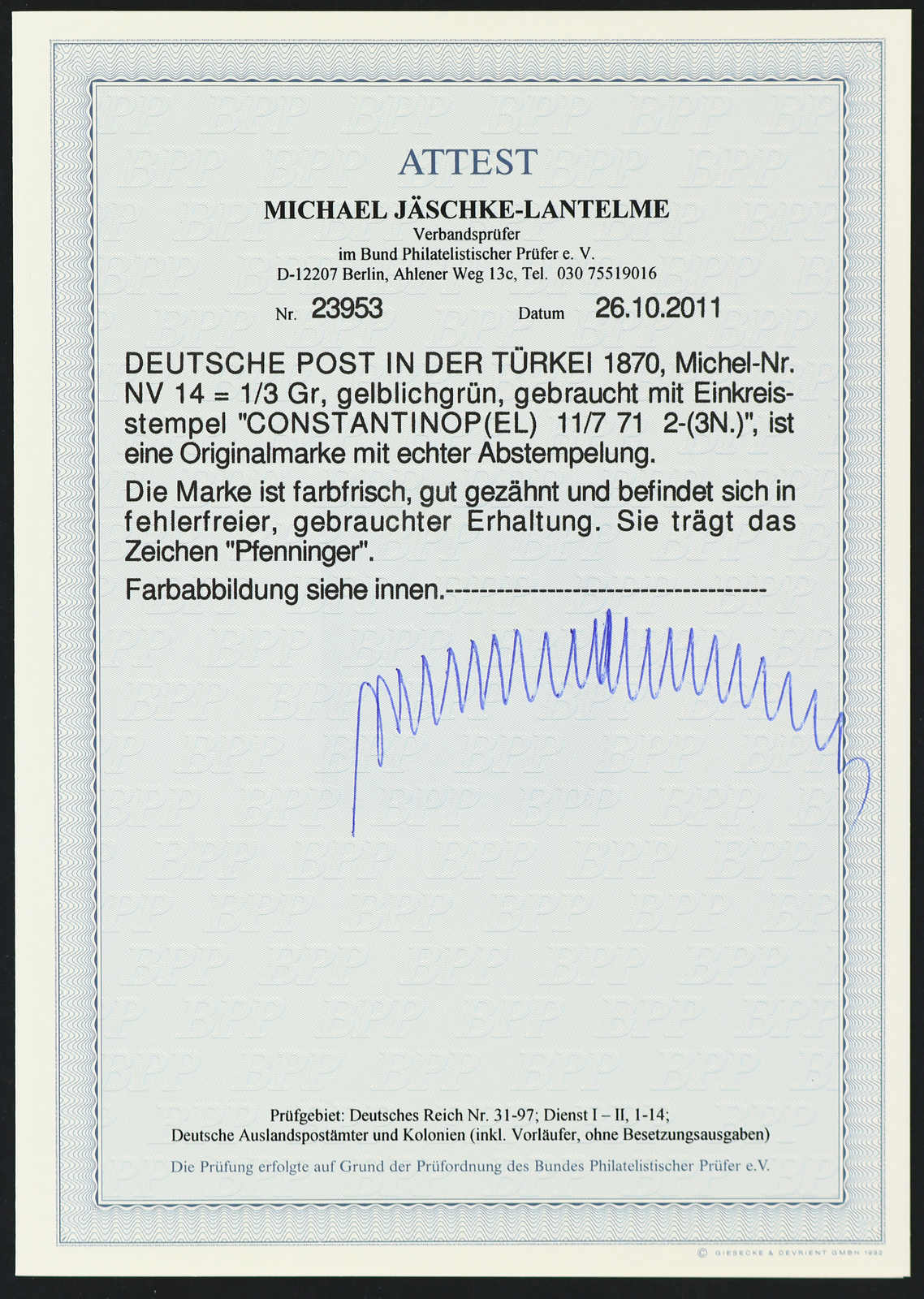 1870, 1/3 Gr. gelblichgrün sauber entwertet "CONSTANTINOP(EL) 11/7 71", farbfrisch, einwandfrei, signiert Pfenninger, Fotoattest Jäschke-Lantelme BPP (ME 1.300,-) (Image) (imagea)