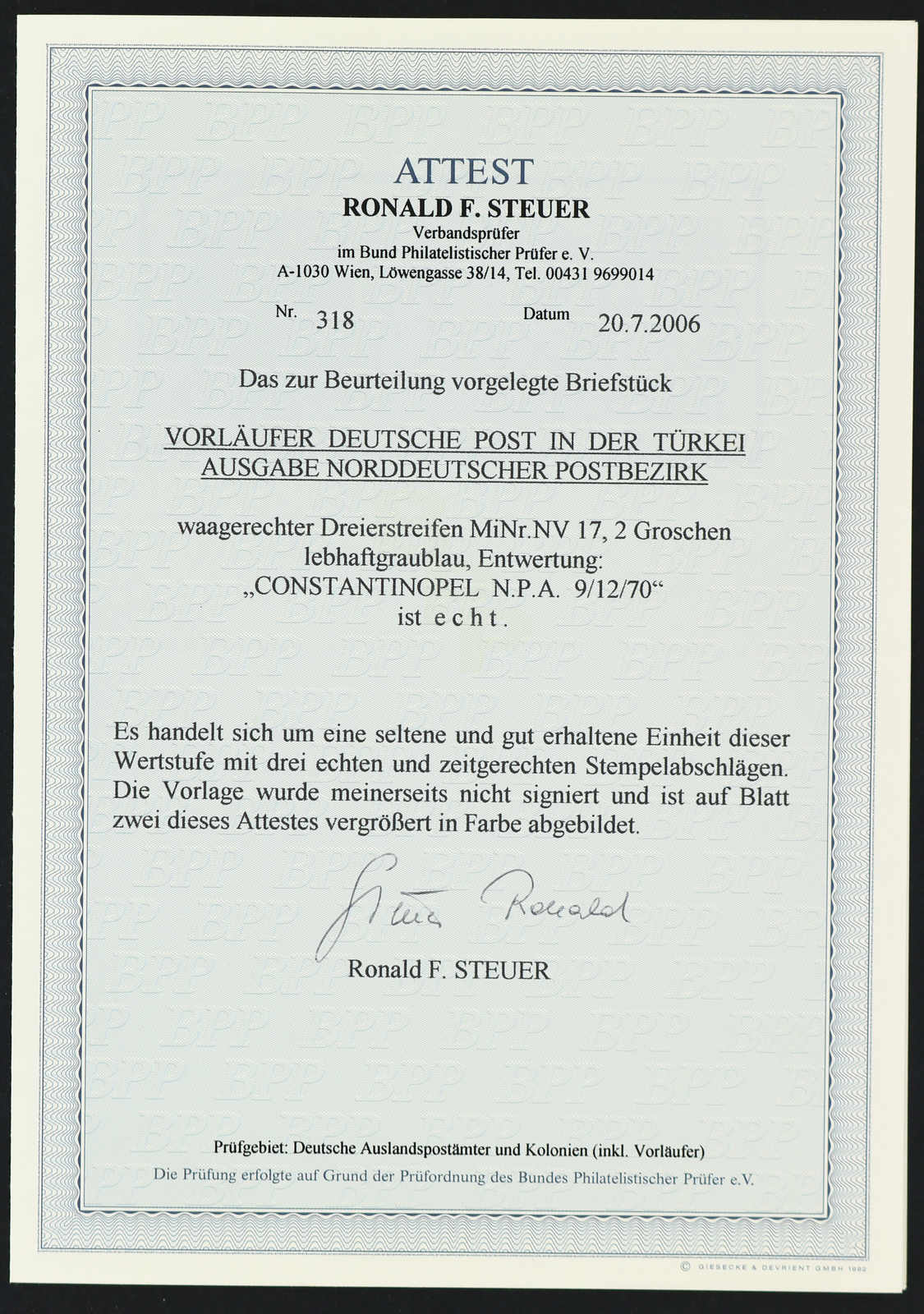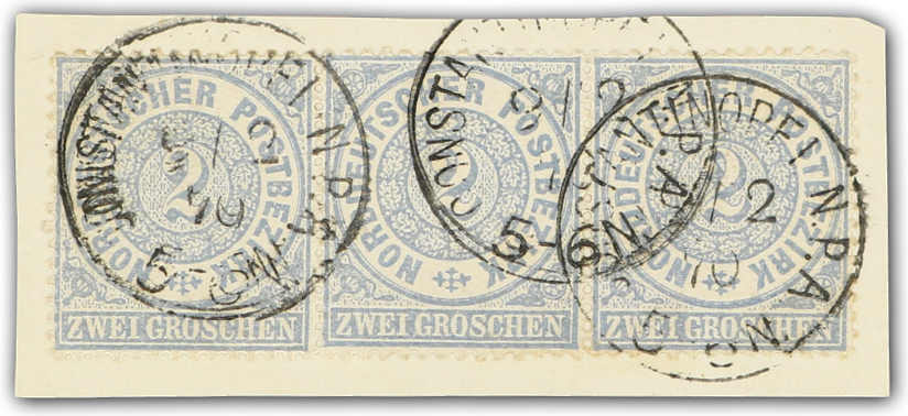 1870, 2 Gr. lebhaftgraublau, waagerechter Dreierstreifen auf Briefstück mit klaren Entwertungen "CONSTANTINOPEL N.P.A. 9/12 70", seltene Einheit in guter Qualität, Fotoattest Steuer BPP (ME 1.050,- für lose Marken) (Image) (imagea)