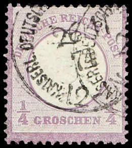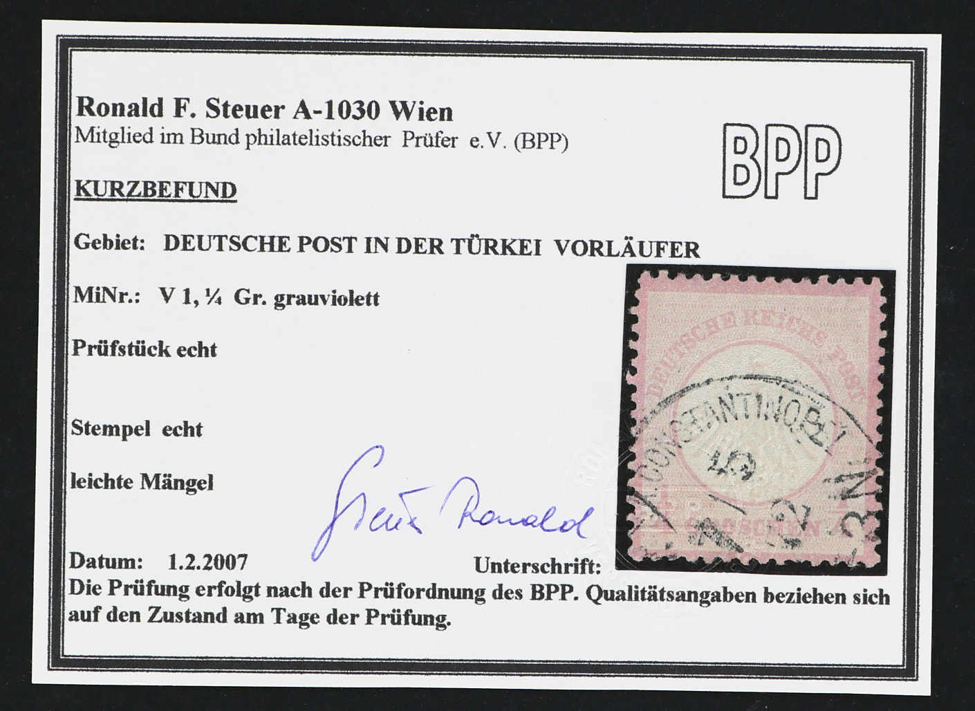 1872, ¼ Gr. großer Brustschild grauviolett, entwertet mit Teilabschlag "KAISERL. DEUTSC(H). P.A.CONSTANINOPEL) 26.11.74", farbfrisch und gut gezähnt, einwandfrei, sign. Mansfeld und Dr. Steuer BPP (ME 700,-) (Image)