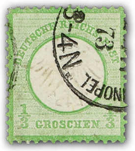 1872, 1/3 Gr. kl. Brustschild dunkelgelblichgrün, klar entwertet mit Teilabschlag "(KAISERL.DEUTSCH. P.A. CONSTANTI)NOPEL ...73 3-4 N.", farbfrisch und gut gezähnt, mehrfach sign. R. Steuer BPP, Bothe BPP, einwandfrei (ME 500,-) (Image)