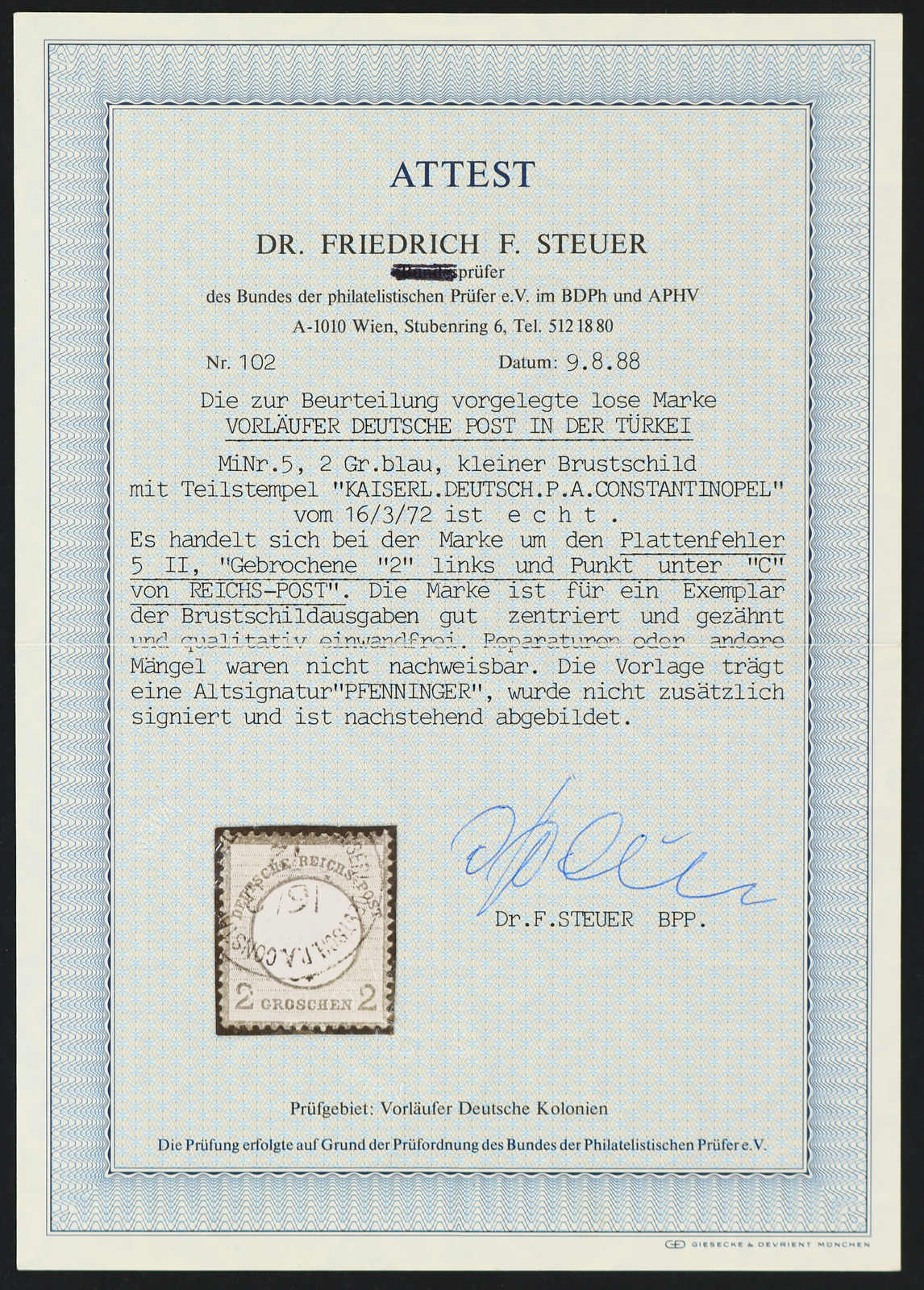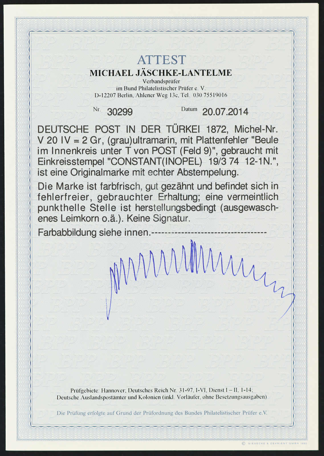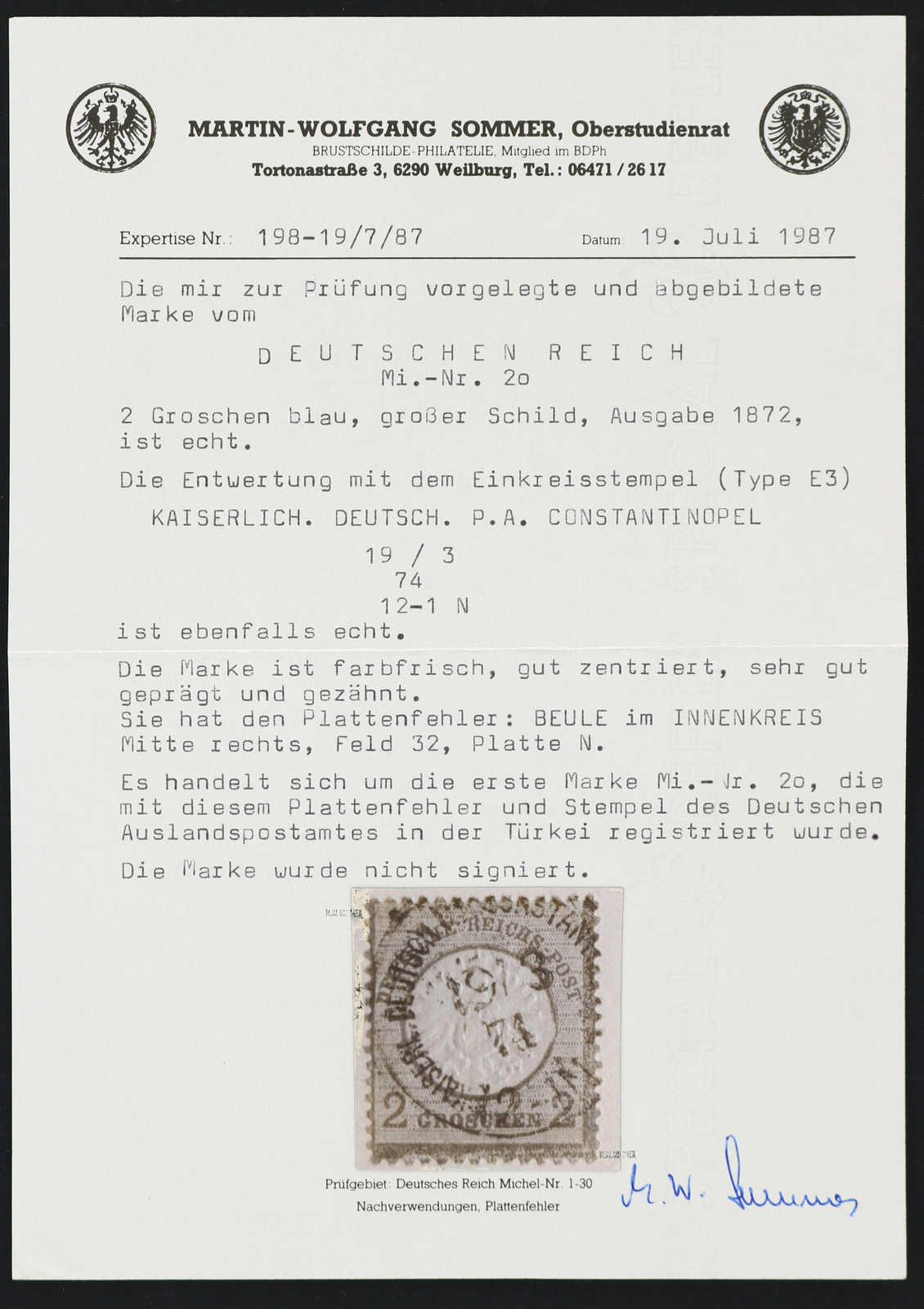 1872, 2 Gr. blau, gestempelt "KAISERL.DEUTSCH.P.A.CONSTANTINOPEL 16/3 72", mit Plattenfehler "gebrochene 2 links und Punkt unter C von REICHS-POST", einwandffrei, signiert Pfenninger, Fotoattest Steuer BPP (ME -,-) (Image) (imagea)