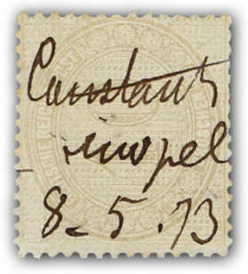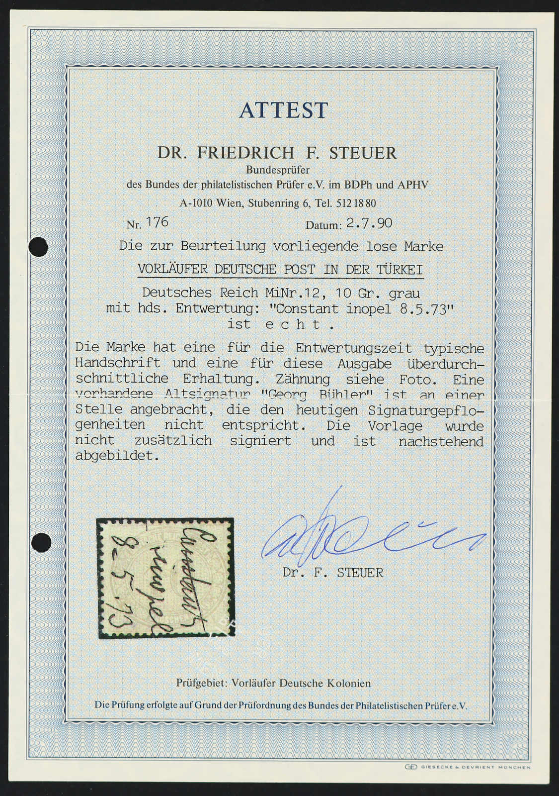 1873, 10 Gr. grau mit handschriftlicher Entwertung "Constant inopel 8.5.73", überdurchschnittliche Qualität, signiert Bühler, Fotoattest Steuer BPP (ME 2.000,-) (Image) (imagea)