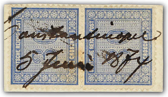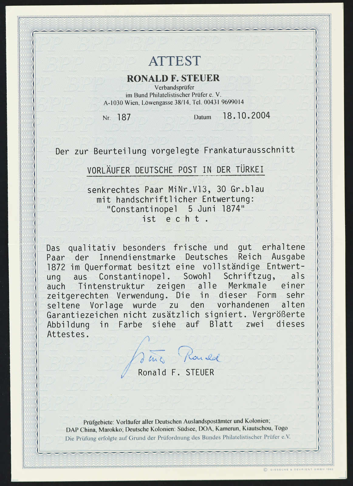 1874, 30 Gr. blau im senkrechten Paar auf Briefstück mit handschriftlicher Entwertung "Constantinopel 5 Juni 1874" über beide Marken, frische Einheit in guter Qualität, etwas tintenfleckig, Fotoattest Steuer BPP (ME 8.000,- für lose) (Image) (imagea)