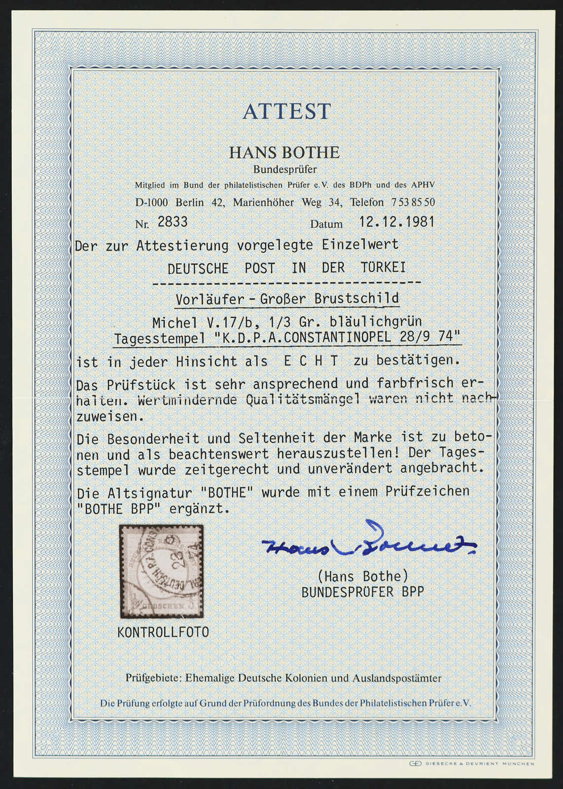 1874, 1/3 Gr. bläulichgrün, klar gestempelt "(KAIS)ERL.DEUTSCH.P.A. CONST(ANTINOPEL) 28/9 74", farbfrisch, einwandfrei, seltene Vorläuferfarbe!, signiert, Fotoattest Bothe BPP (ME 3.500,-) (Image) (imagea)