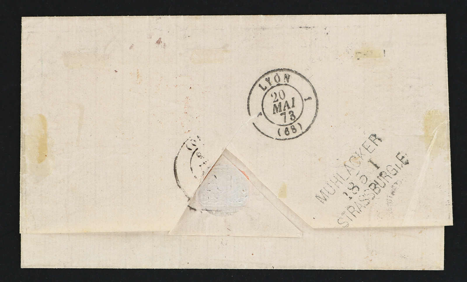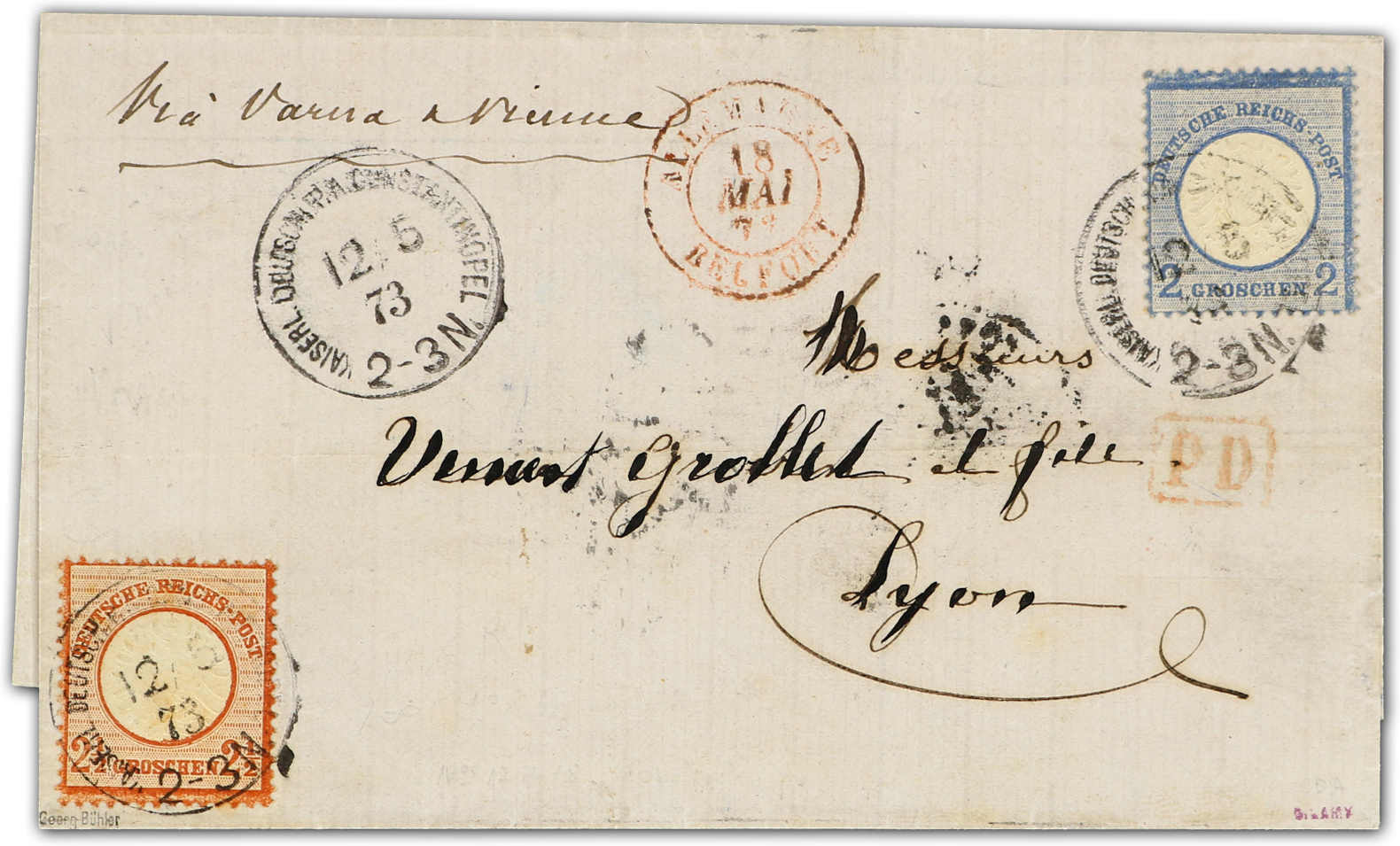 1873, 2 Gr. grauultramarin und 2½ Gr. mittelrötlichbraun großer Brustschild als portogerechte Frankatur auf Auslandsbrief nach Lyon/Frankreich, aufgegeben "KAISERL.DEUTSCH.P.A. CONSTANTINOPEL 12.5.73", mit hsl. Leitvermerk "Via Varna &