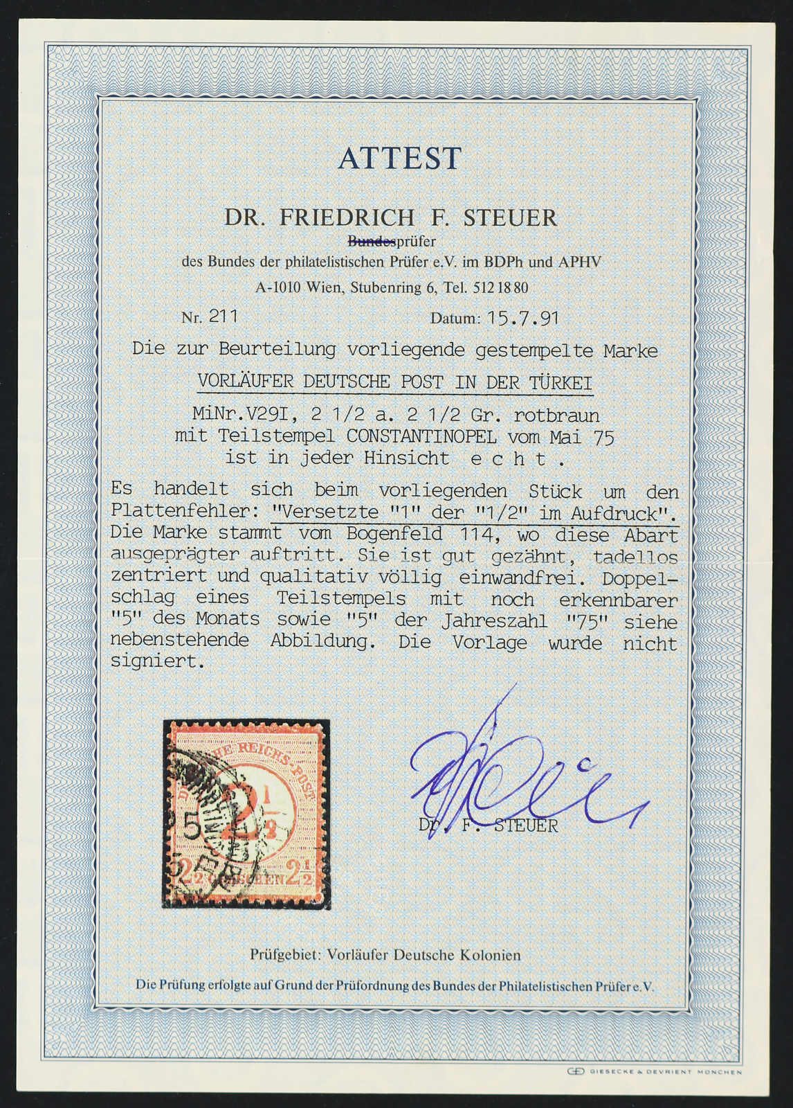 1875, 2½ auf 2½ Gr. rotbraun mit Plattenfehler "versetzte 1 der ½ im Aufdruck", gestempelt "CONSTANTINOPEL (.) 5 75", einwandfrei, Fotoattest Steuer BPP (ME 1.400,-) (Image) (imagea)