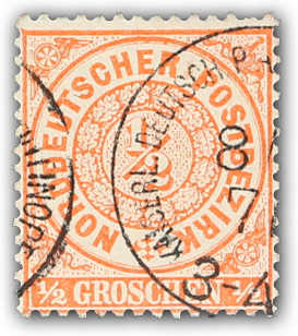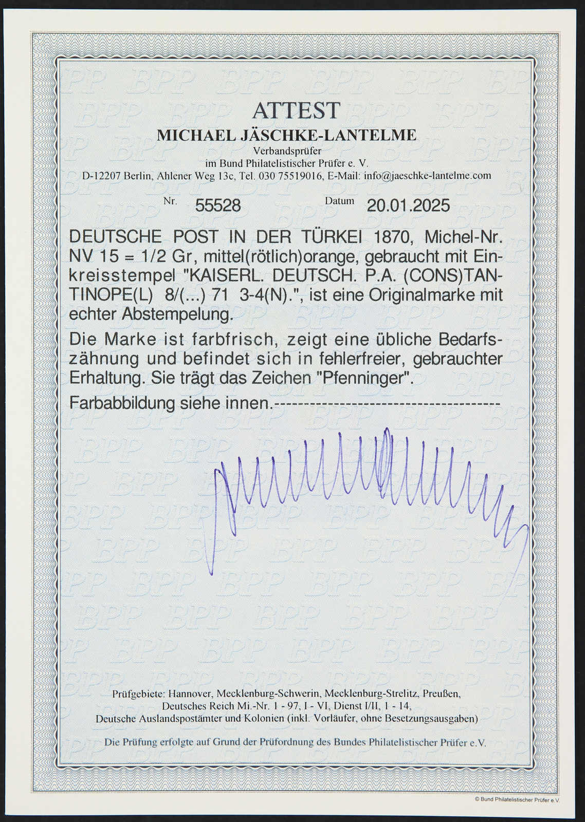 1870, ½ Gr. Ziffern im Oval mittel(rötlich)orange, klar gestempelt "KAISERL. DEUTSCH. P.A. (CONS)TANTINOPE(L) 8/(...) 71", farbfrisch und einwandfrei mit üblicher Bedarfszähnung, signiert Pfenninger, Fotoattest Jäschke-Lantelme BPP
