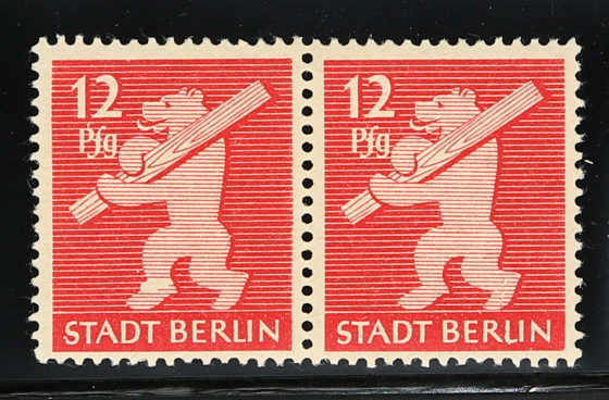 1945, 12 Pfg. im waagerechten Paar, linke Marke mit dem Plattenfehler "Bär mit Fußbinde", ungebraucht (entfalzt, Plattenfehlermarke nur wenig betroffen), einwandfrei (Image)