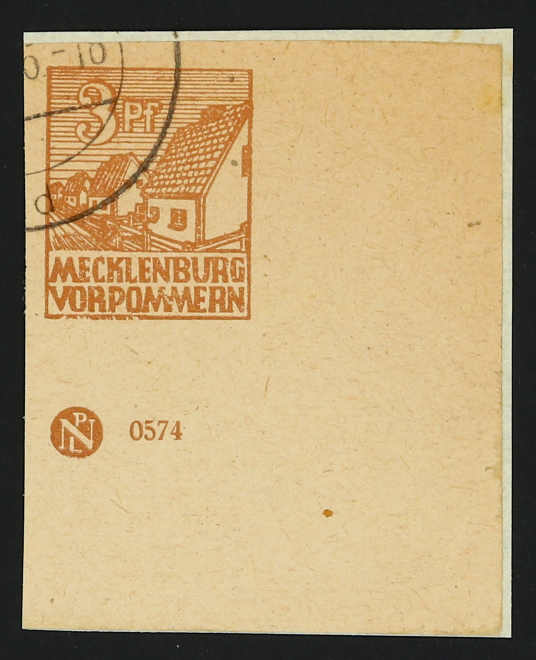 1946, 3 Pfg. Freimarke mittelorangebraun auf graustichigem Papier mit dem Plattenfehler "Beschädigungen zwischen MM von VORPOMMERN und der Randlinie darunter" (Feld 100) aus der rechten unteren Bogenecke, ideal zur Feldbestimmung, auf