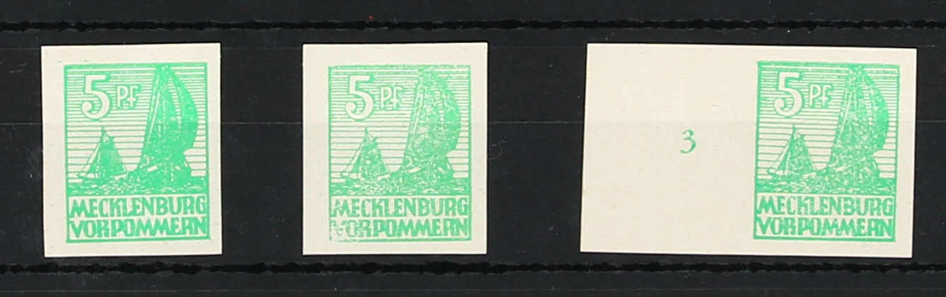 1946, 5 Pfg. Freimarke auf dickem Kreidepapier in beiden Farben, postfrisch, einwandfrei, b-Farbe geprüft Kramp BPP, dazu weitere Marke vom linken Seitenrand postfrisch, augenscheinlich ebenfalls in b-Farbe, jedoch ungeprüft (ME 424,-) (Image)