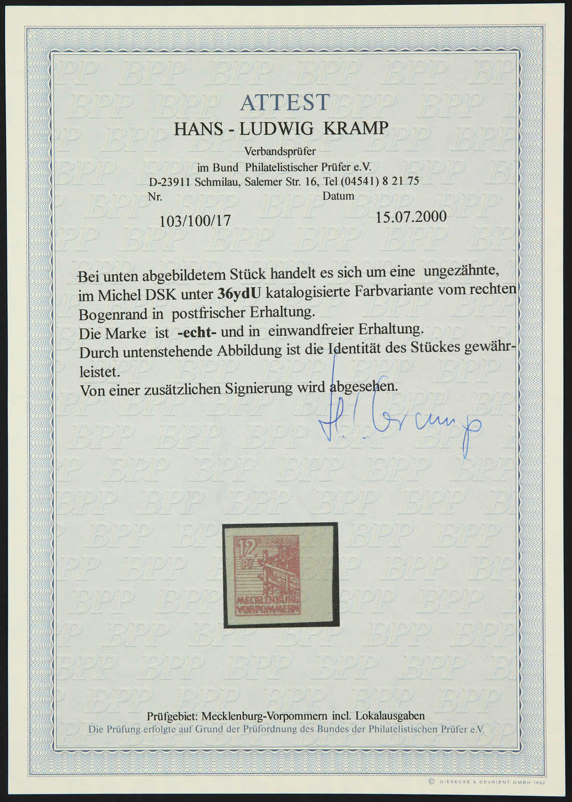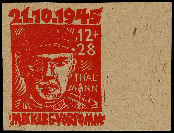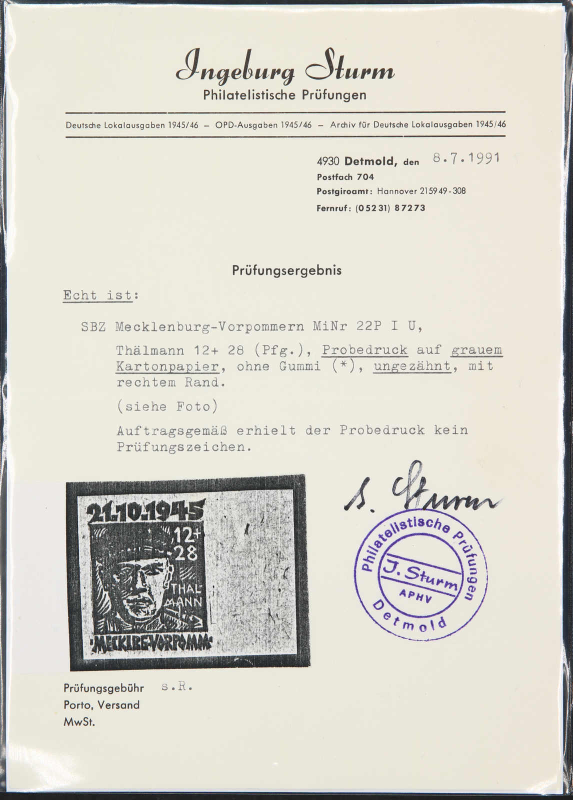 1945, 12 Pfg. Opfer des Faschismus, ungezähnter Probedruck auf grauem, ungummiertem Kartonpapier vom rechten Bogenrand, allseits breitrandig, unsigniert, seltene Marke in einwandfreier Qualität, Alt-Attest Sturm (ME 900,-) (Image) (imagea)