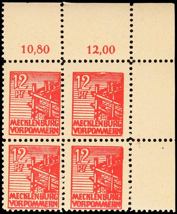 1946, 12 Pfg. Freimarke auf dünnem glatten Papier in der Farbe DUNKELROSA im Viererblock aus der rechten oberen Bogenecke, postfrisch, einwandfrei, geprüft Kramp BPP (ME 720,- +) (Image)
