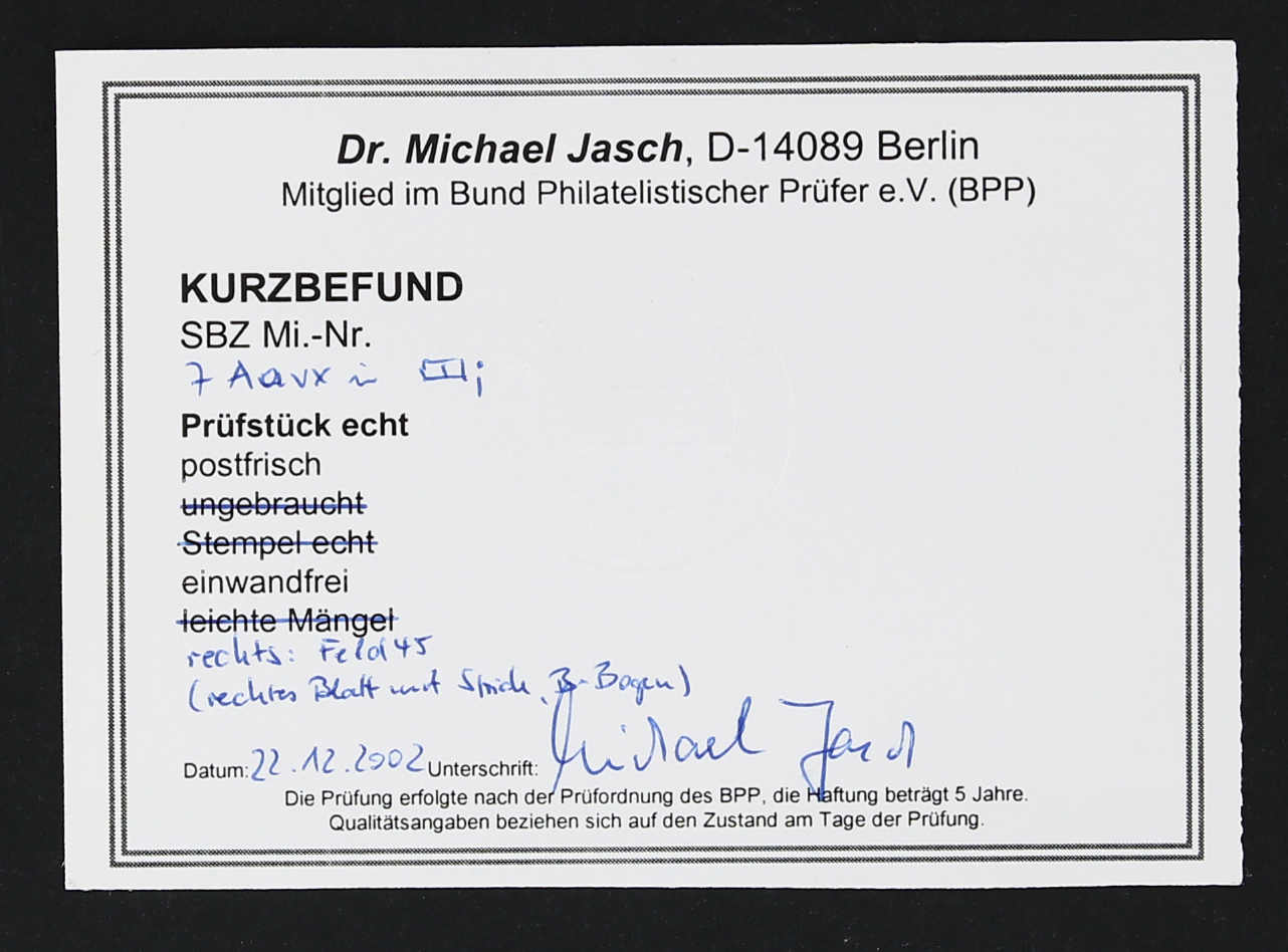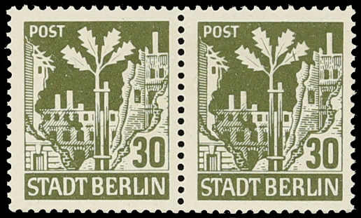 1945, 30 Pfg. Stieleiche mit Papier v und glatter Gummierung im waagerechten Paar, dabei rechte Marke mit Druckabart "Querstrich auf dem rechten Blatt" (Feld 45), postfrisch, einwandfrei, Kurzbefund Dr. Jasch BPP (ME 800,- +) (Image) (imagea)