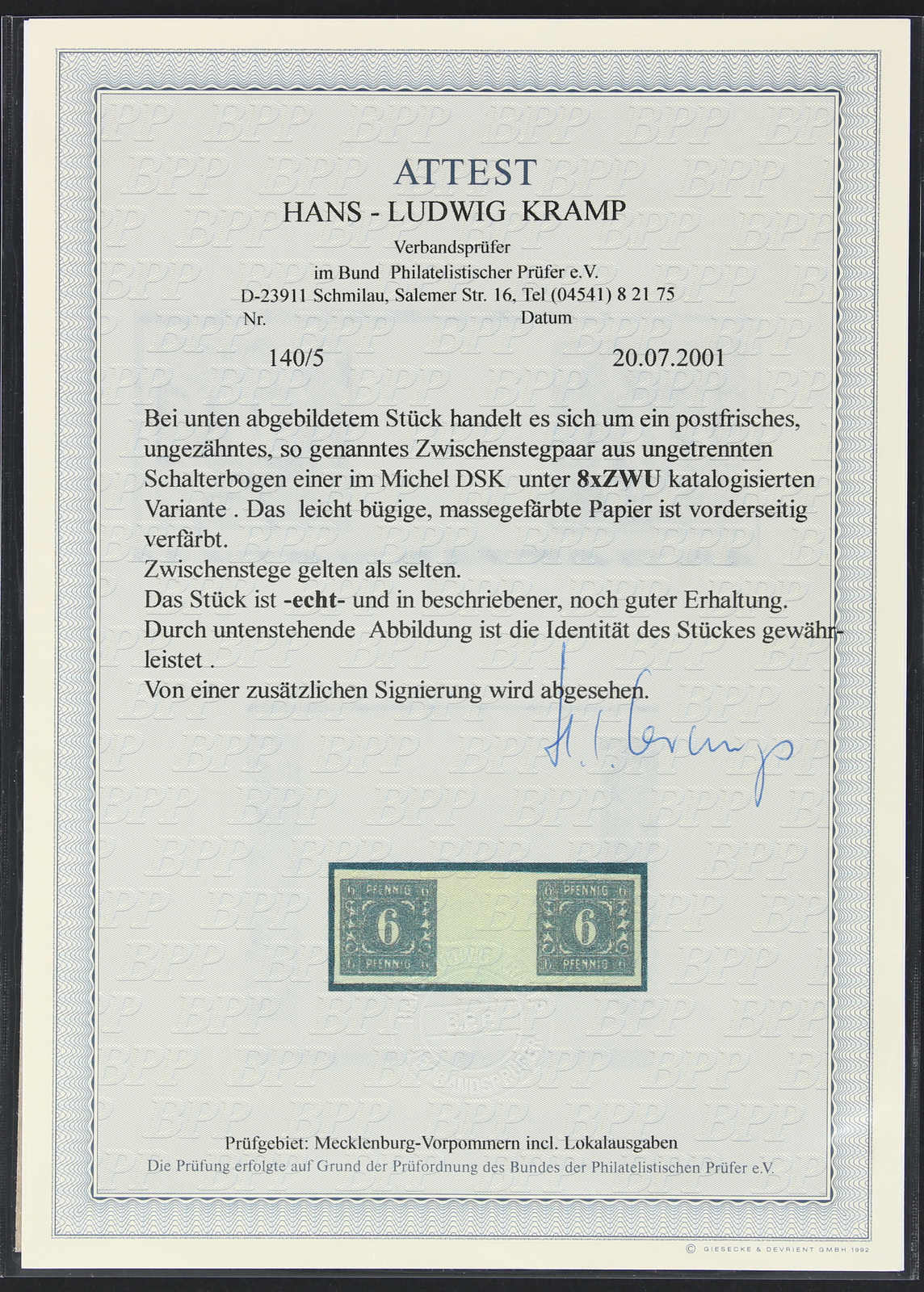 1945, 8 Pfg. Ziffer ungezähnt im Zwischenstegpaar, postfrisch, vollrandig geschnitten, leicht bügig und im Steg leicht vorgefaltet, etwas verfärbt, sonst einwandfrei, Zwischenstegpaare sind selten, Fotoattest Kramp BPP (ME 1.400,-) (Image) (imagea)