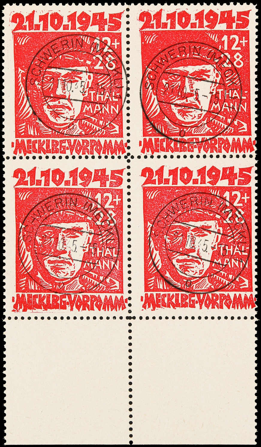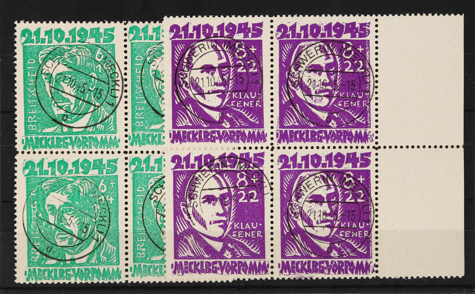 1945, 6 bis 12 Pfg. Opfer des Faschismus in Viererblocks (8 Pfg. vom rechten Seitenrand, hier angetrennt, 12 Pfg. vom Unterrand), jede Marke mit sauberem Vollstempel "SCHWERIN 21.10.45", waagerechte Perforation zwischen den Marken