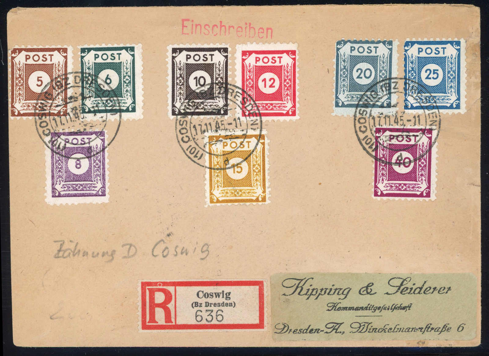 1945, Postmeistertrennung Coswig, die kpl. Ausgabe von 9 Werten in der Zähnung L 10 auf Sammler-Einschreibbrief, aufgegeben "COSWIG BZ. DRESDEN 17.11.45", adressiert nach Dresden, rückseitig mit Ankunftsstp., saubere Qualität (Image)