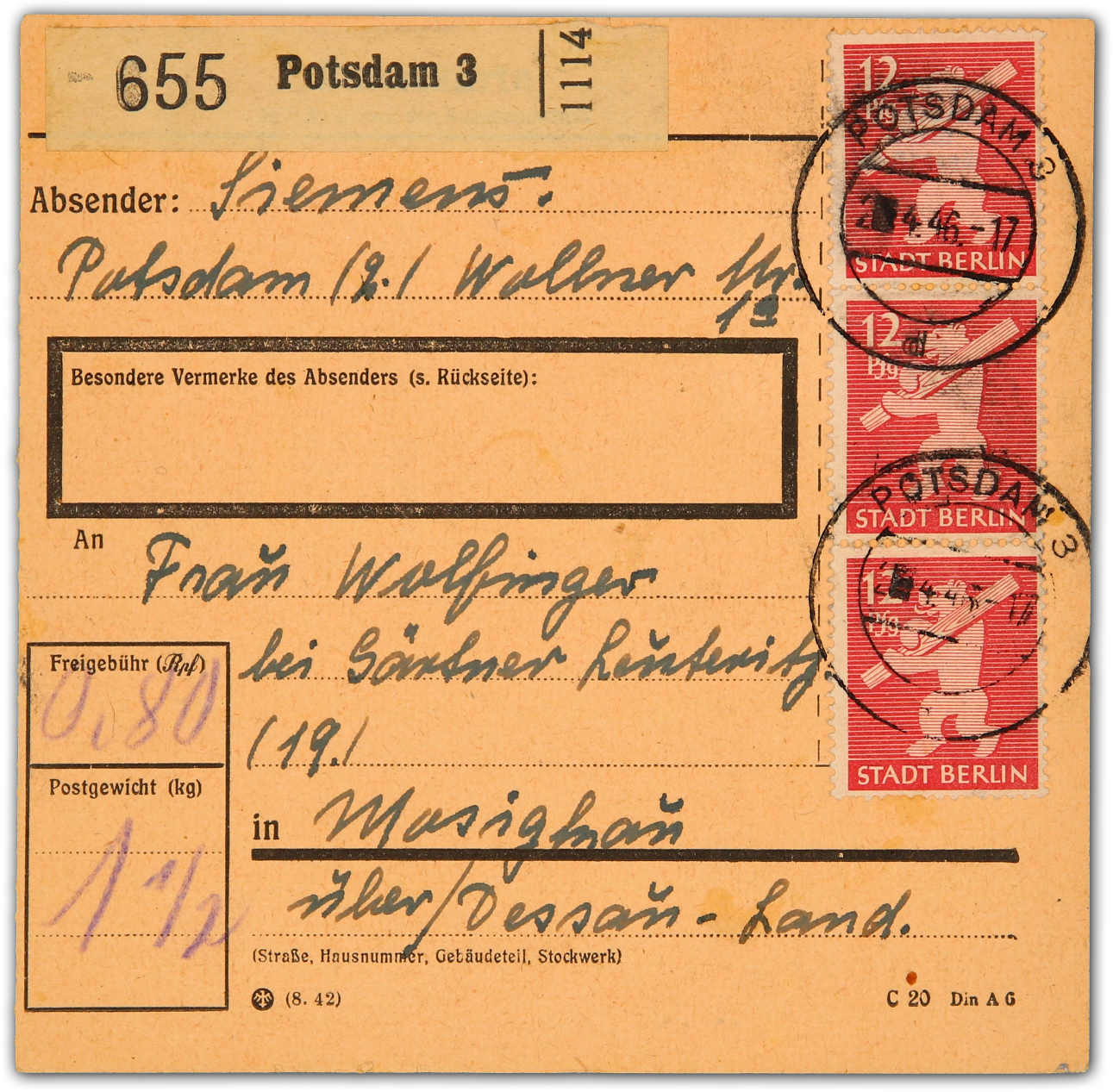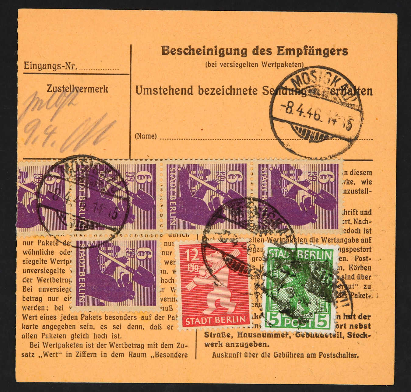 1945, 12 Pfg. Bär in 3 Exmplaren vorderseitig und weitere Marke rückseitig mit Zufrankatur 6 Pfg. im Viererstreifen (1 Marke durch Absenderabschnitt-Abtrennung halbiert) und 5 Pfg. auf Paketkarte für ein Paket von 1½ kg von "POTSDAM 3 d