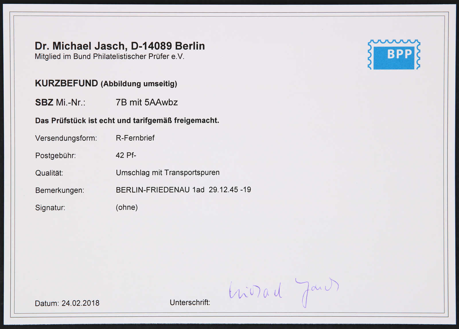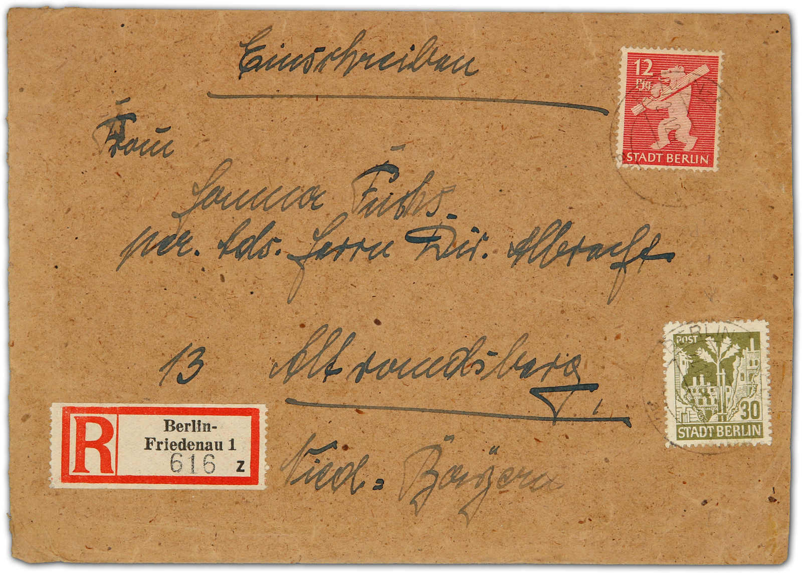 1945, 30 Pfg. durchstochen mit 12 Pfg. gezähnt tarifgerecht auf R-Brief ab "BERLIN-FRIEDENAU 1ad 9.12.45-19" nach Altrandsberg, Umschlag mit Transportspuren, sonst einwandfrei, Fotobefund Dr. Jasch BPP (ME 400,-) (Image) (imagea)