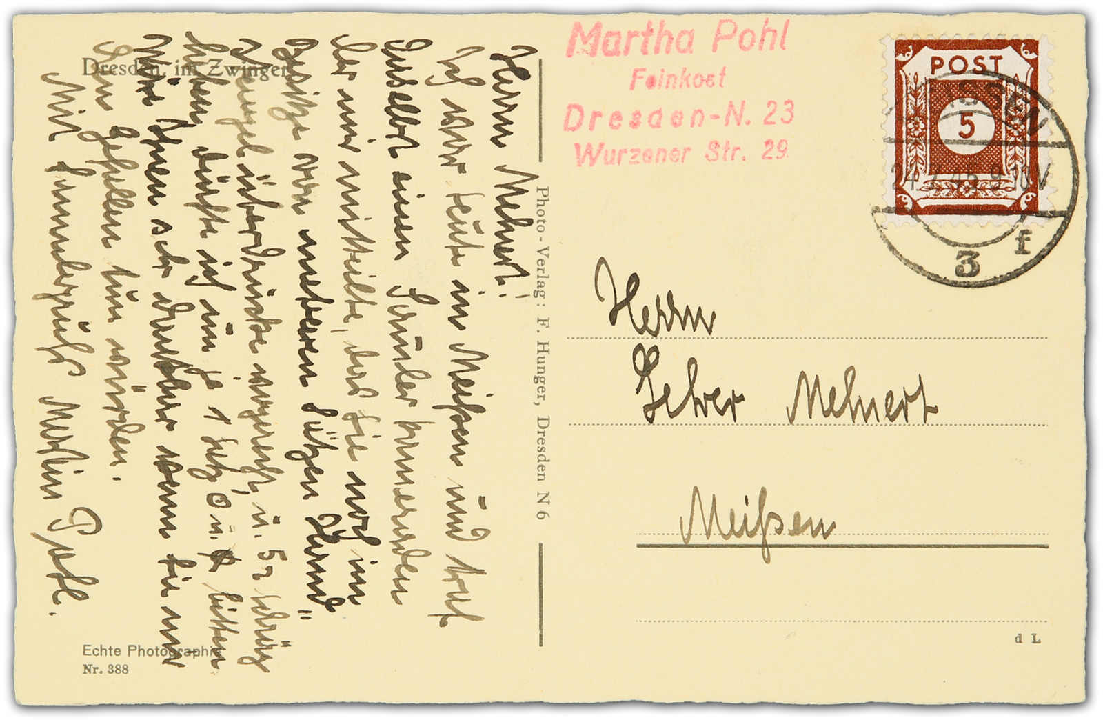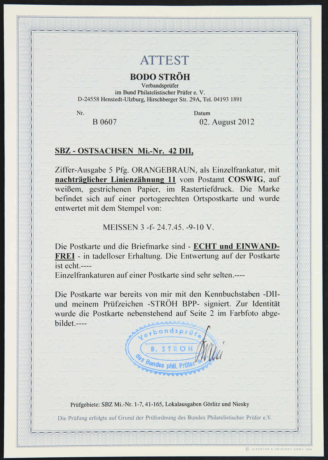 1945, 5 Pfg. braun mit Postmeistertrennung Coswig L 11 als EF auf Orts-Postkarte in "MEISSEN 3 f 24.7.45 9-10V", sehr sauber in einwandfreier Qualität, schon die lose Marke ist deutlich seltener, tarifgerecht gebraucht eine unerkannte