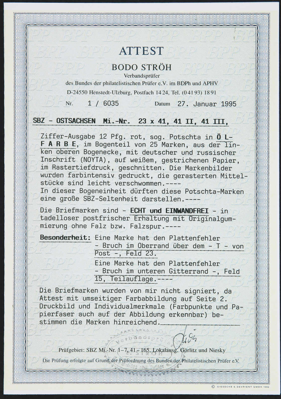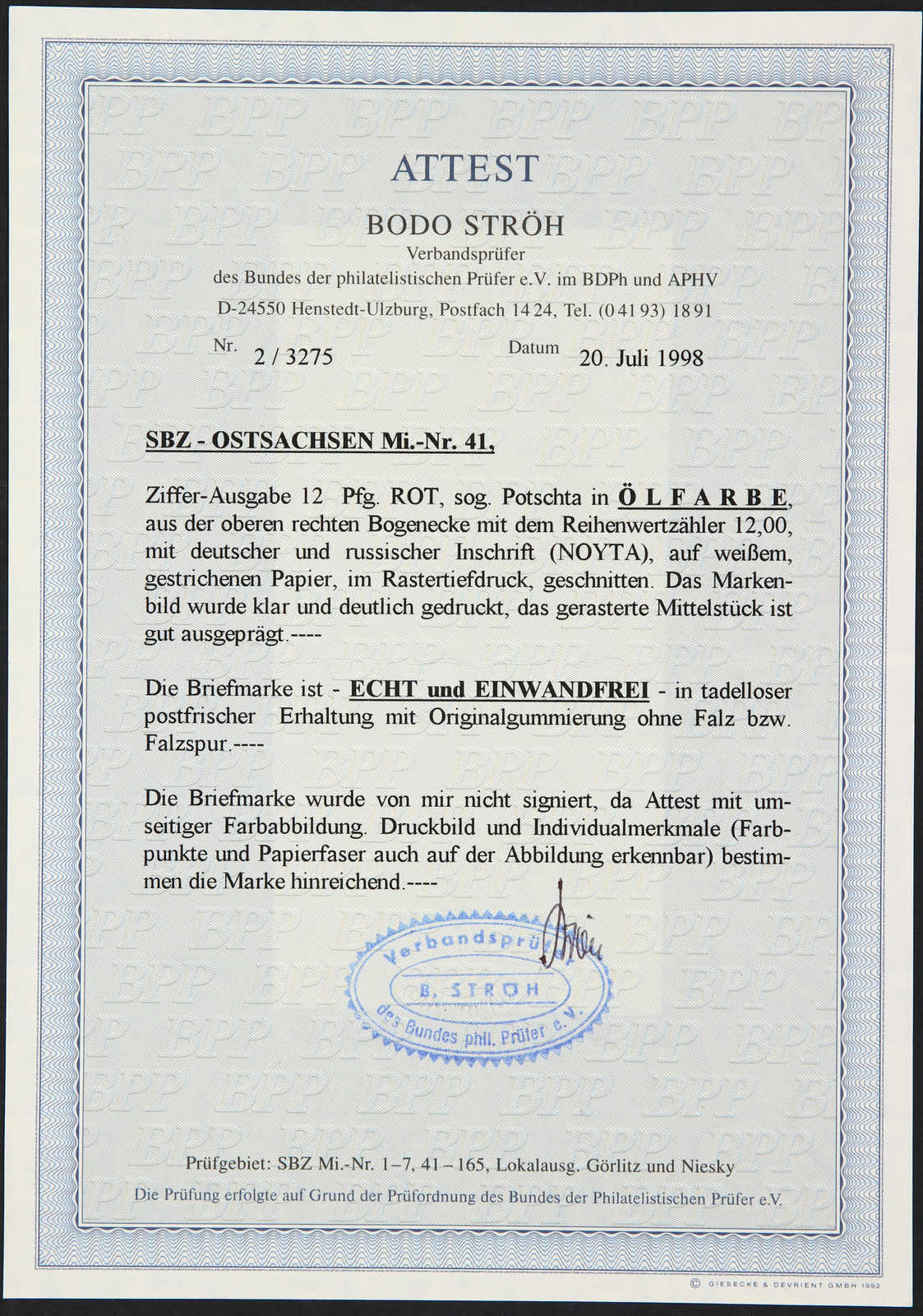 1945, 12 Pfg. Potschta rot, Ölfarbe, mit Plattenfehler "Bruch im Oberrand über T von POST", einwandfrei, geprüft Zierer BPP, Fotoattestkopie Ströh BPP für ehemaligen Bogenteil (ME 1.000,-) (Image) (imagea)