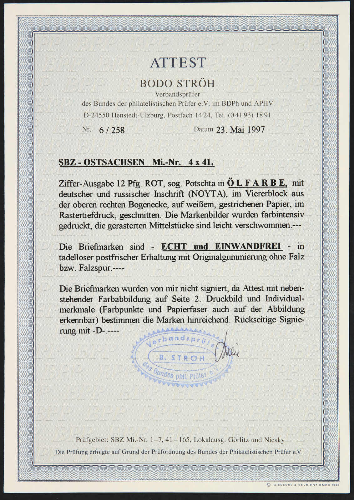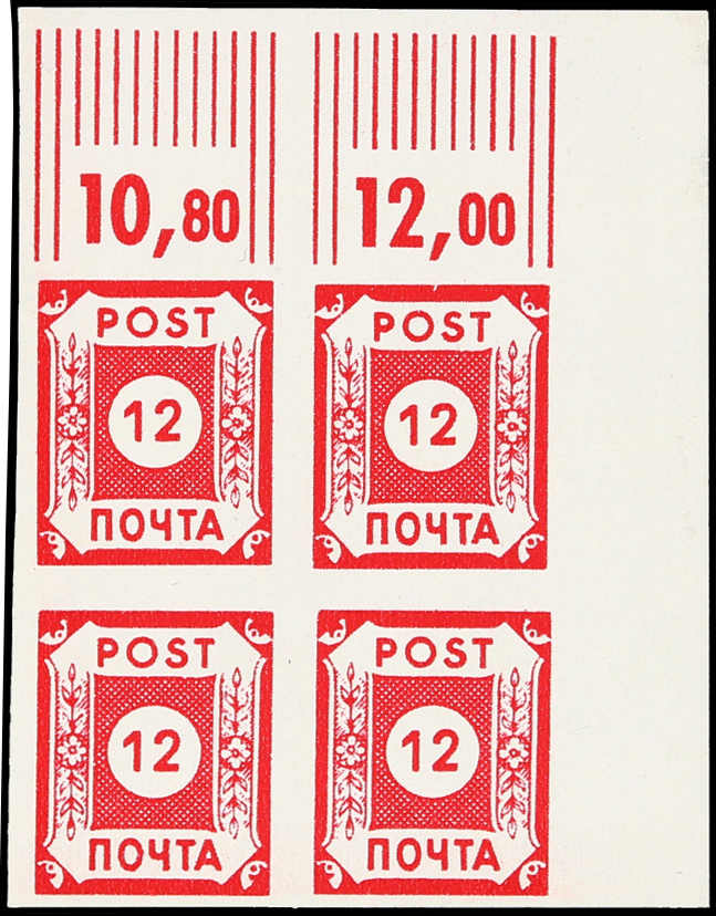1945, 12 Pfg. Potschta rot, Ölfarbe, postfrischer Viererblock aus der oberen rechten Bogenecke, auch im Rand makellos postfrisch, einwandfrei, jeder Wert signiert, Fotoattest Ströh BPP (ME 2.200,-++) (Image) (imagea)