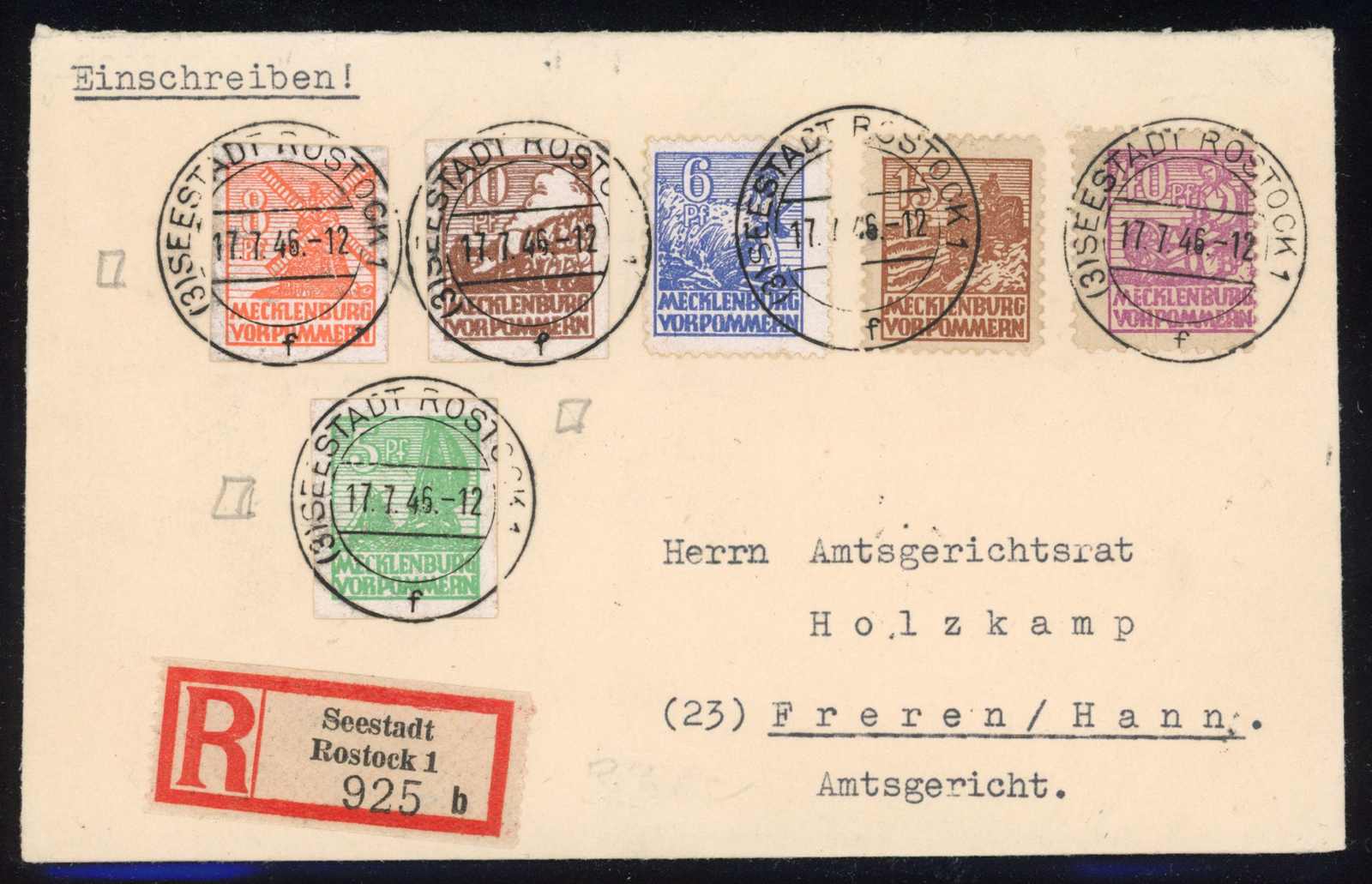 1946, 5 bis 10, 15 und 40 Pfg. Abschiedsausgabe als portogerechte Frankatur von 84 Pfg. auf Einschreibbrief, aufgegeben "SEESTADT ROSTOCK 1 17.7.46", adressiert nach Freren/Hann., saubere Qualität (Image)