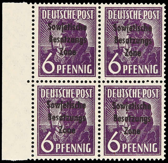 1948, 6 Pfg. Arbeiter schwärzlichbläulichviolett postfrisch, Viererblock vom Bogenrand links in einwandfreier Qualität, ungefaltet und unsigniert, Fotoattest Dr. Ruscher BPP (ME 2.600,-) (Image) (imagea)