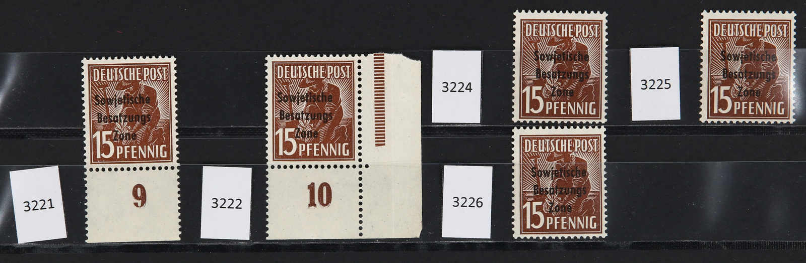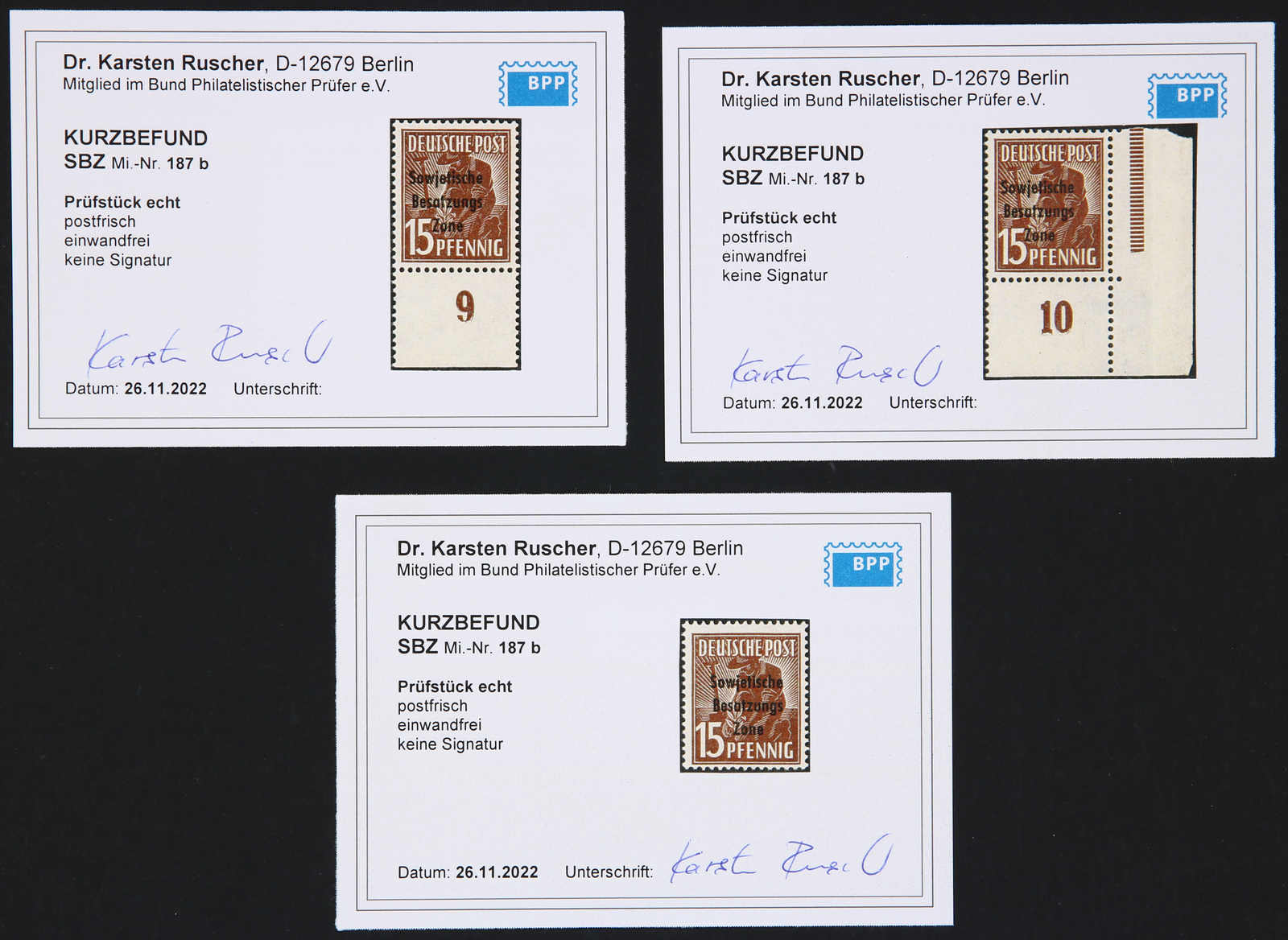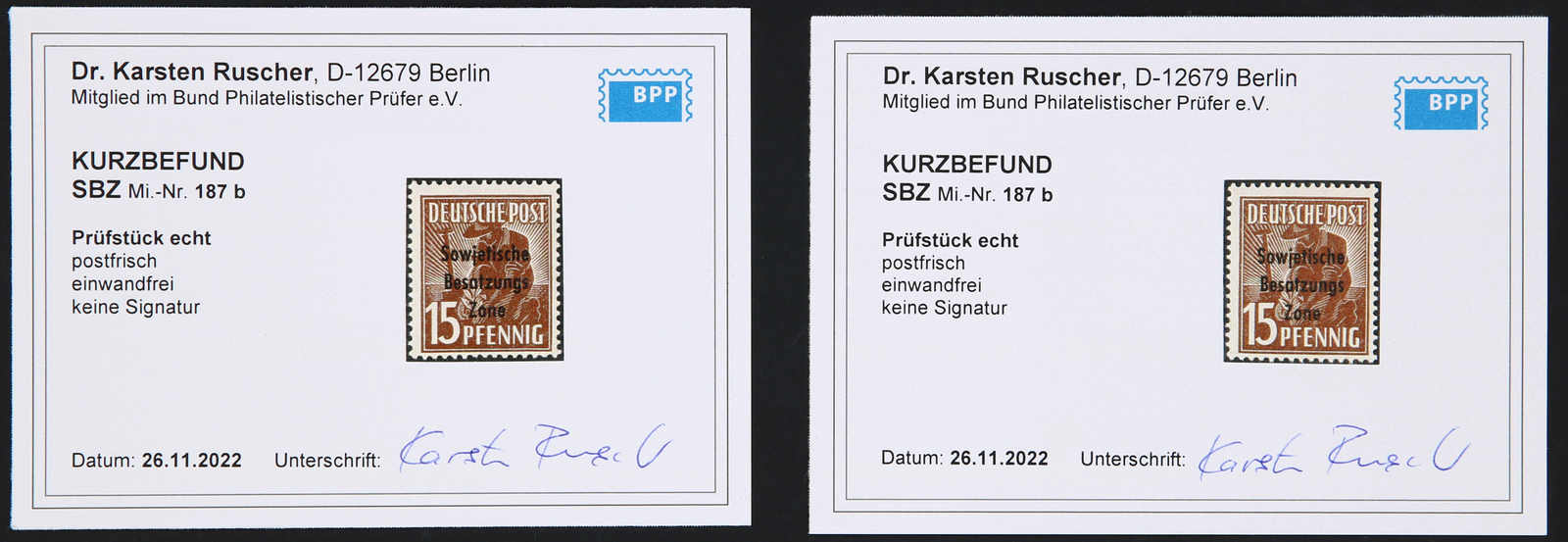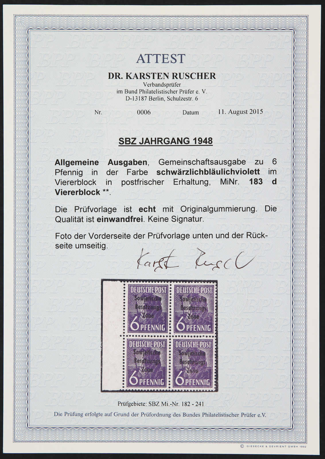 1948, 15 Pfg. Maschinenaufdruck in der besseren Farbe Dunkelbraun postfrisch, 5mal je mit Kurzbefund Dr. Ruscher BPP 11/2022, einwandfrei (ME 1.500,-)