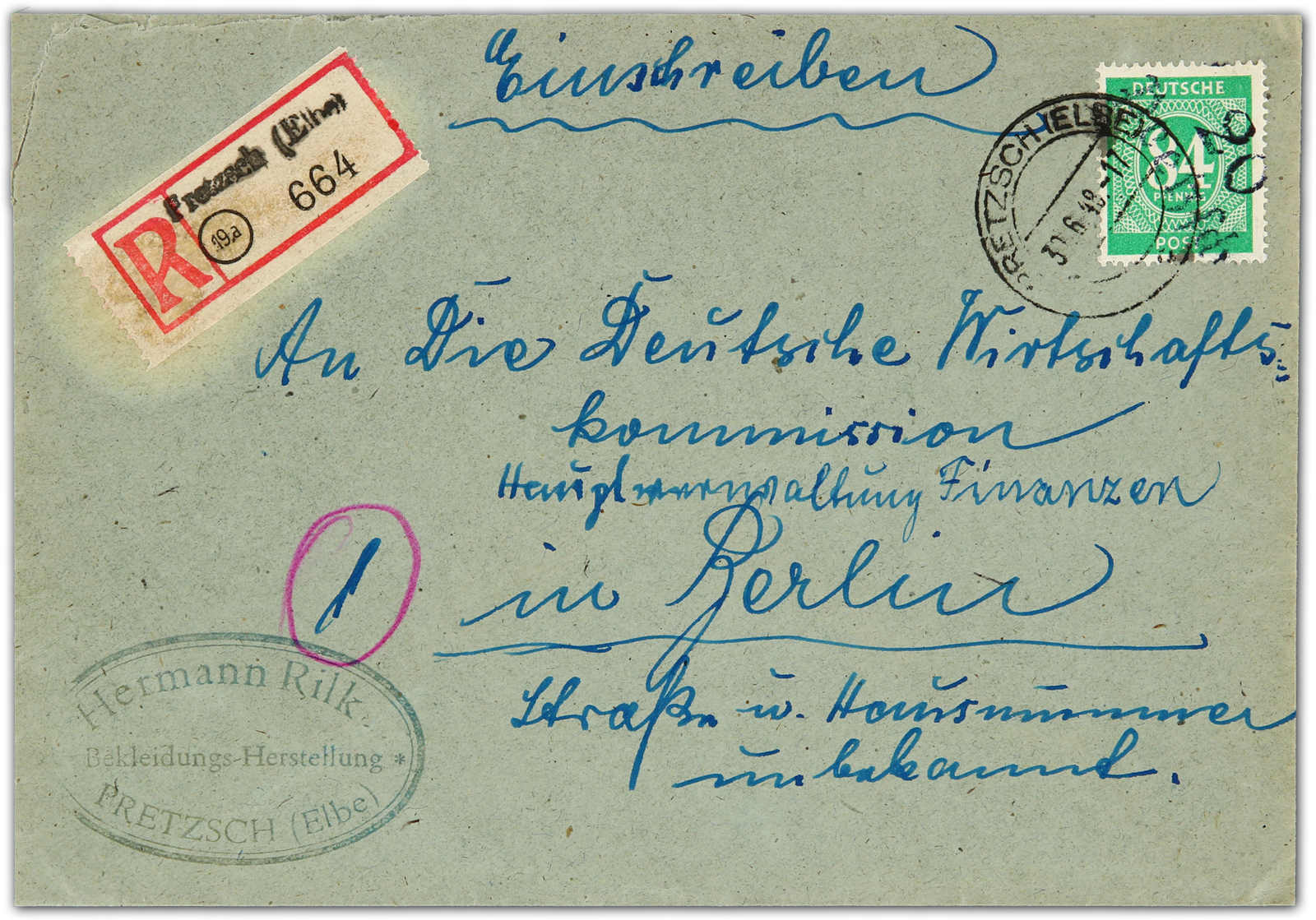 1948, 84 Pfg. Ziffern mit schwarzviolettem Handstempelaufdruck "20 Pretzsch" als portogerechte Einzelfrankatur auf R-Fernbrief, rückseitig Ankunftsstempel, Bedarfsbrief der Wirtschaftskommission mit bisher unbekannter Aufdruckfarbe,
