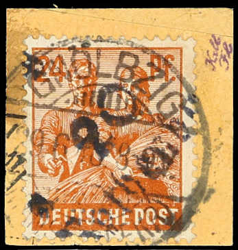 1948, 24 Pfg. Maurer und Bäuerin mit Bezirksaufdruck "20 Rothenburg a" (Handbuch Nr. 20/132) auf Briefstück, Stempel "GNÖLBZIG (MANSF. SEEKR.) 29.6.48", einwandfrei, der Handstempel wurde nur in geringem Umfang und nur auf dem 24