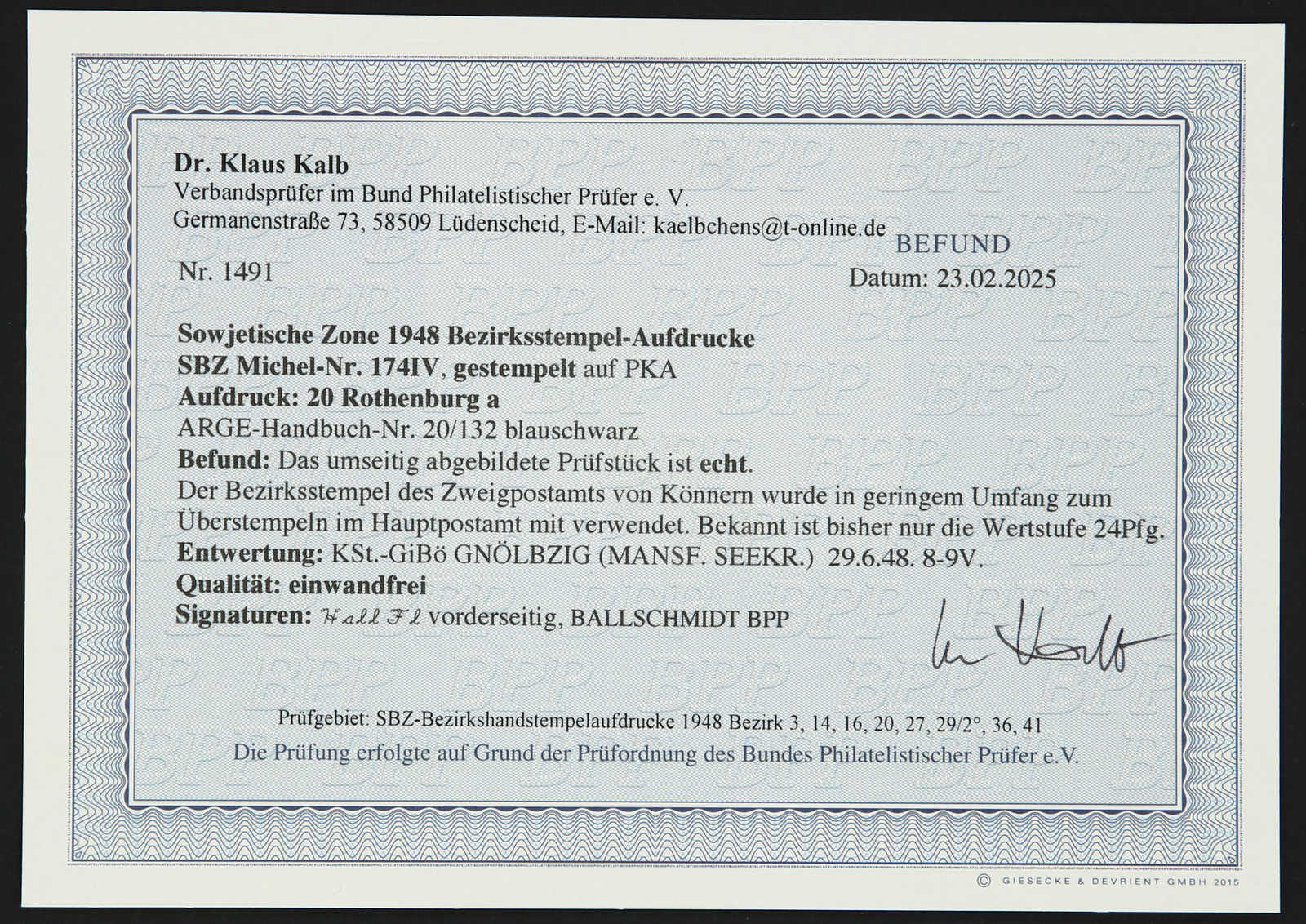 Pfg.-Wert eingesetzt, sign. Hall. Flä. und Ballschmidt BPP, Fotobefund Dr. Kalb BPP (Image) (imagea)