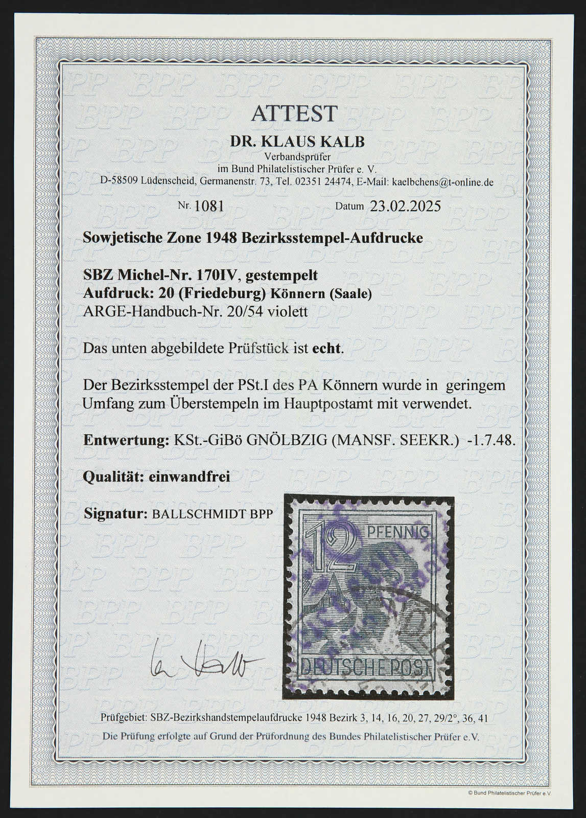 1948, 12 Pfg. Arbeiter mit violettem Handstempelaufdruck "20 (Friedeburg) Könnern (Saale)", gestempelt, einwandfrei, signiert Ballschmidt BPP, Fotoattest Dr. Kalb 02/2025 (Image) (imagea)