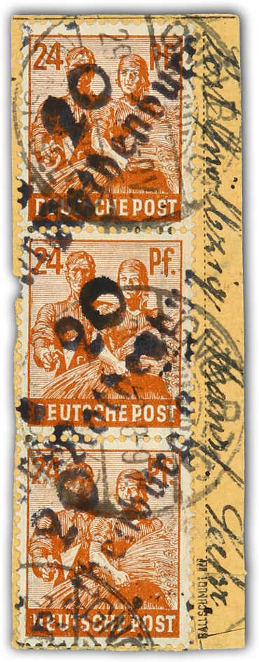 1948, 24 Pfg. Arbeiter mit blauschwarzem Handstempelaufdruck "20 Rothenburg a" im senkrechten Dreierstreifen auf Paketkartenausschnitt, einwandfrei, sehr seltener Aufdruck! signiert Ballschmidt BPP, Fotoattest Dr. Kalb BPP 02/2025 für