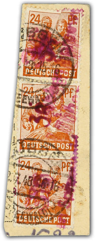 1948, 24 Pfg. Freimarke mit lilarotem Bezirksstempelaufdruck "36 Lübben (Spreewald)" im senkrechten Dreierstreifen auf Paketkartenabschnitt, Stempel "LÜBBEN 2.7.48", Aufdruck T.a von Schönwalde, die oberen beiden Marken mit zusätzlichem