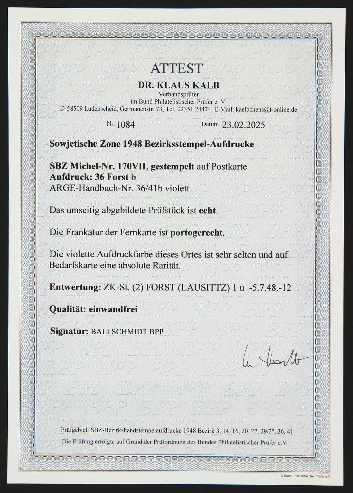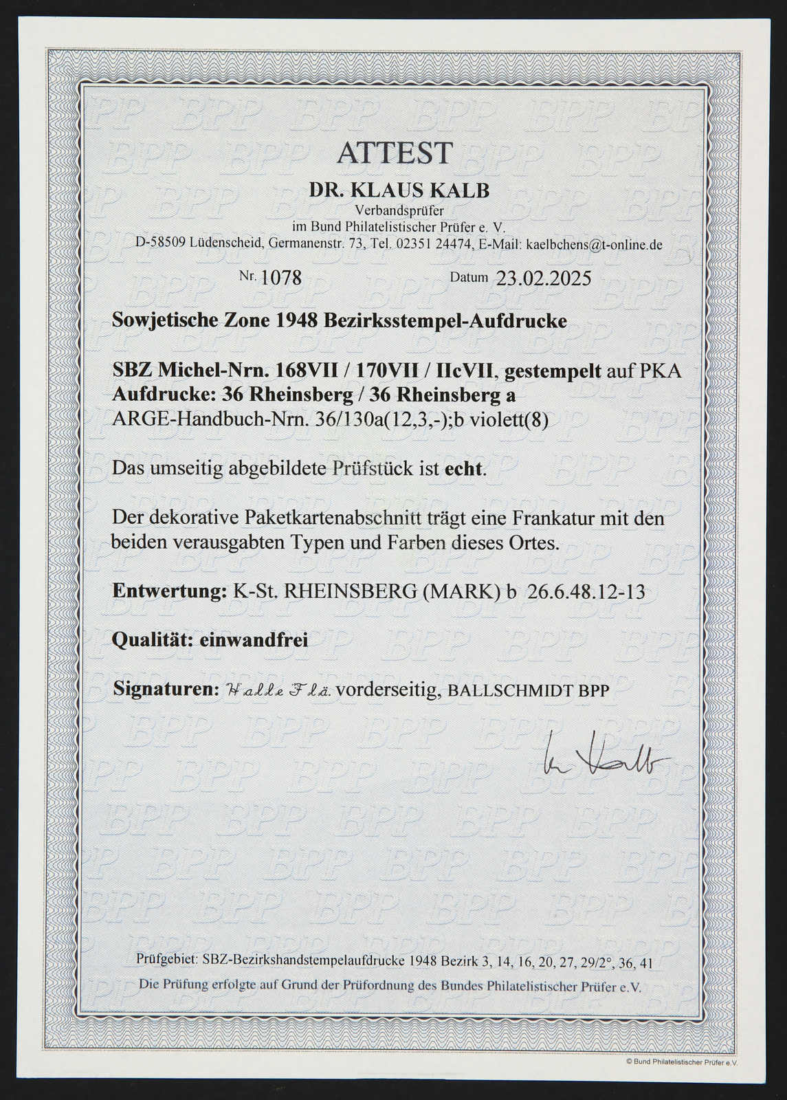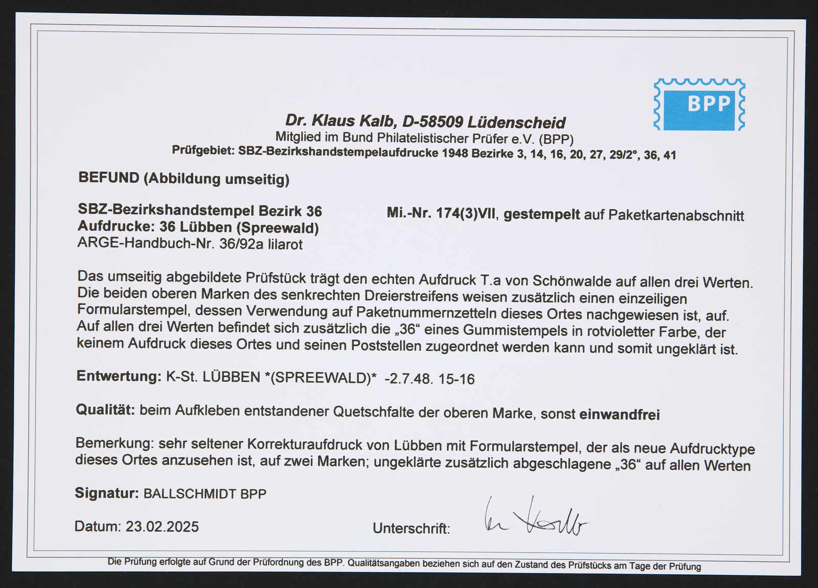 Korrekturaufdruck von Lübben mit Formularstempel, der als neue Aufdrucktype dieses Ortes anzusehen ist, obere Marke mit Aufklebefalte, sonst einwandfrei, sign. Ballschmidt BPP, Kurzbefund Dr. Kalb BPP 02/2025 (Image) (imagea)