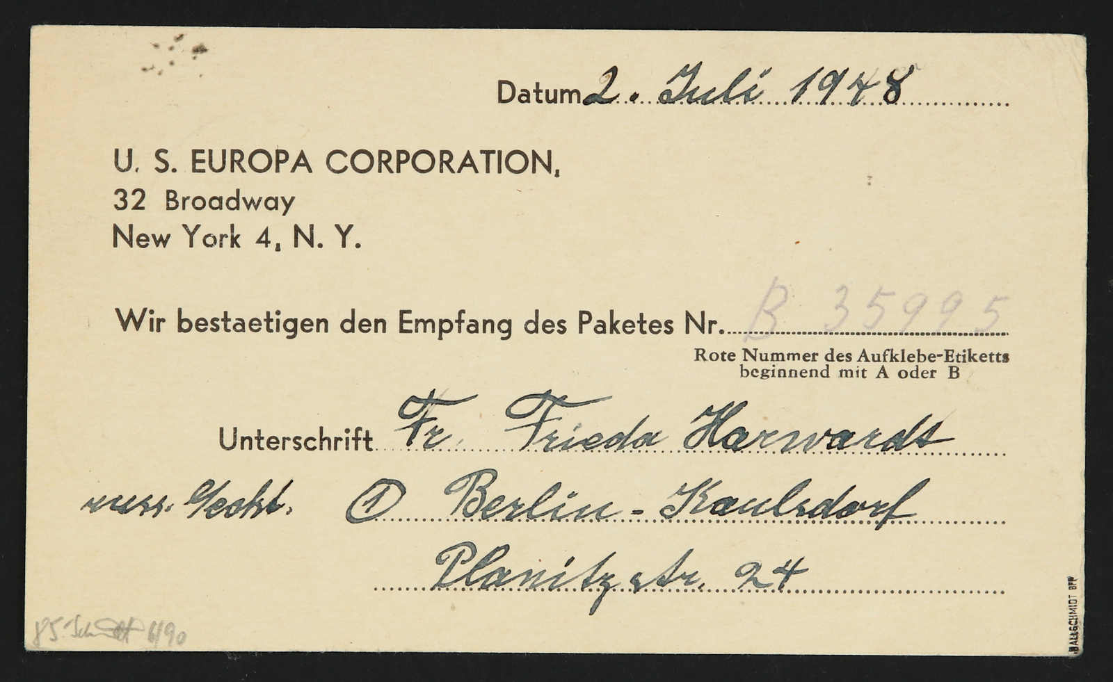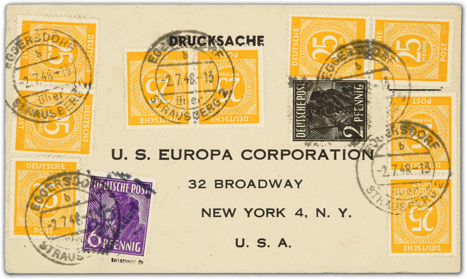 portogerecht auf Auslandskarte nach New York, vorgedruckte Karte zur Empfangsbestätigung für ein CARE-Paket, Stempel "EGGERSDORF über STRAUSBERG 2.7.48", seltener Aufdruck auf 2 Pfg. und ungeklärte neue Aufdrucktype auf der 6 Pfg., einwandfrei, sign.