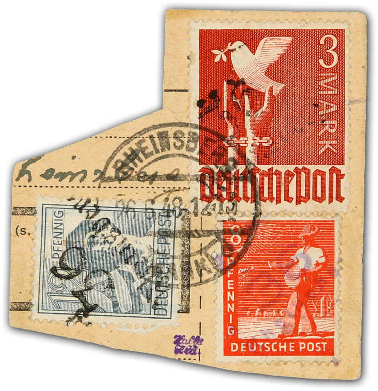 1948, 8 und 12 Pfg. sowie 3 M. Freimarken mit Bezirksstempelaufdruck "36 Rheinsberg a" bzw. "36 Rheinsberg" auf Paketkartenausschnitt, Stempel "RHEINSBERG (MARK) 26.6.48", dekorativ mit Frankatur beider ausgegebener Typen und Farben