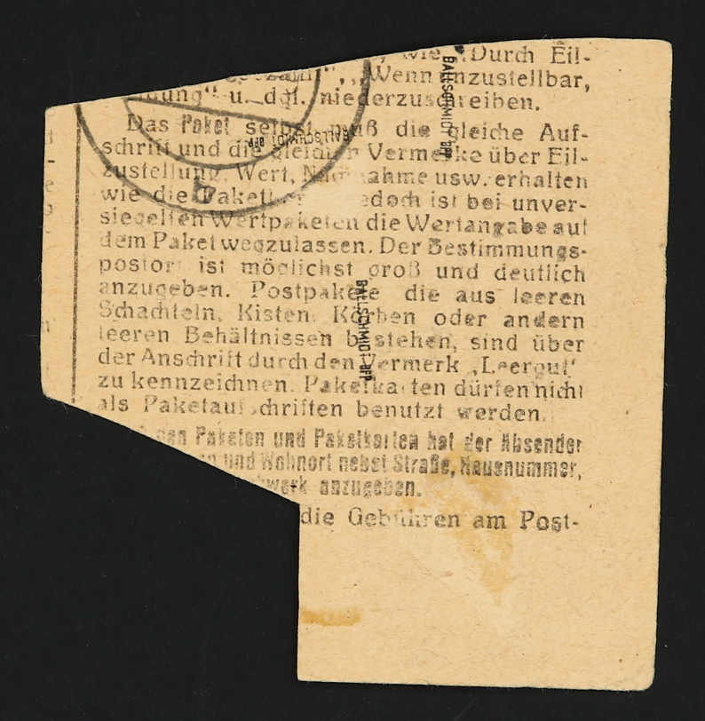 einzeiligen Formularstempel, dessen Verwendung auf Paketnummernzetteln dieses Ortes nachgewiesen ist, auf allen 3 Werten zusätzlich rotvioletter Gummistempel "36", der keinem Aufdruck dieses Ortes zuzuordnen und somit ungeklärt ist, sehr seltener