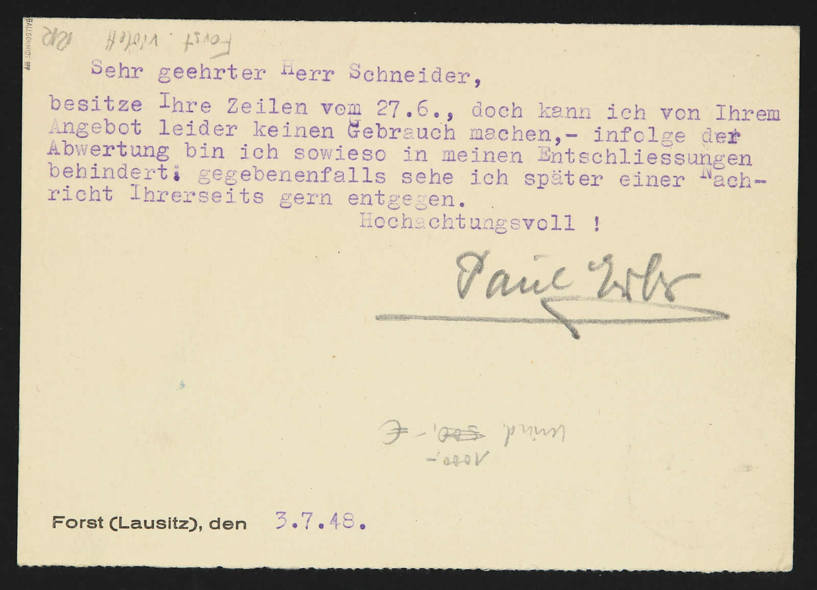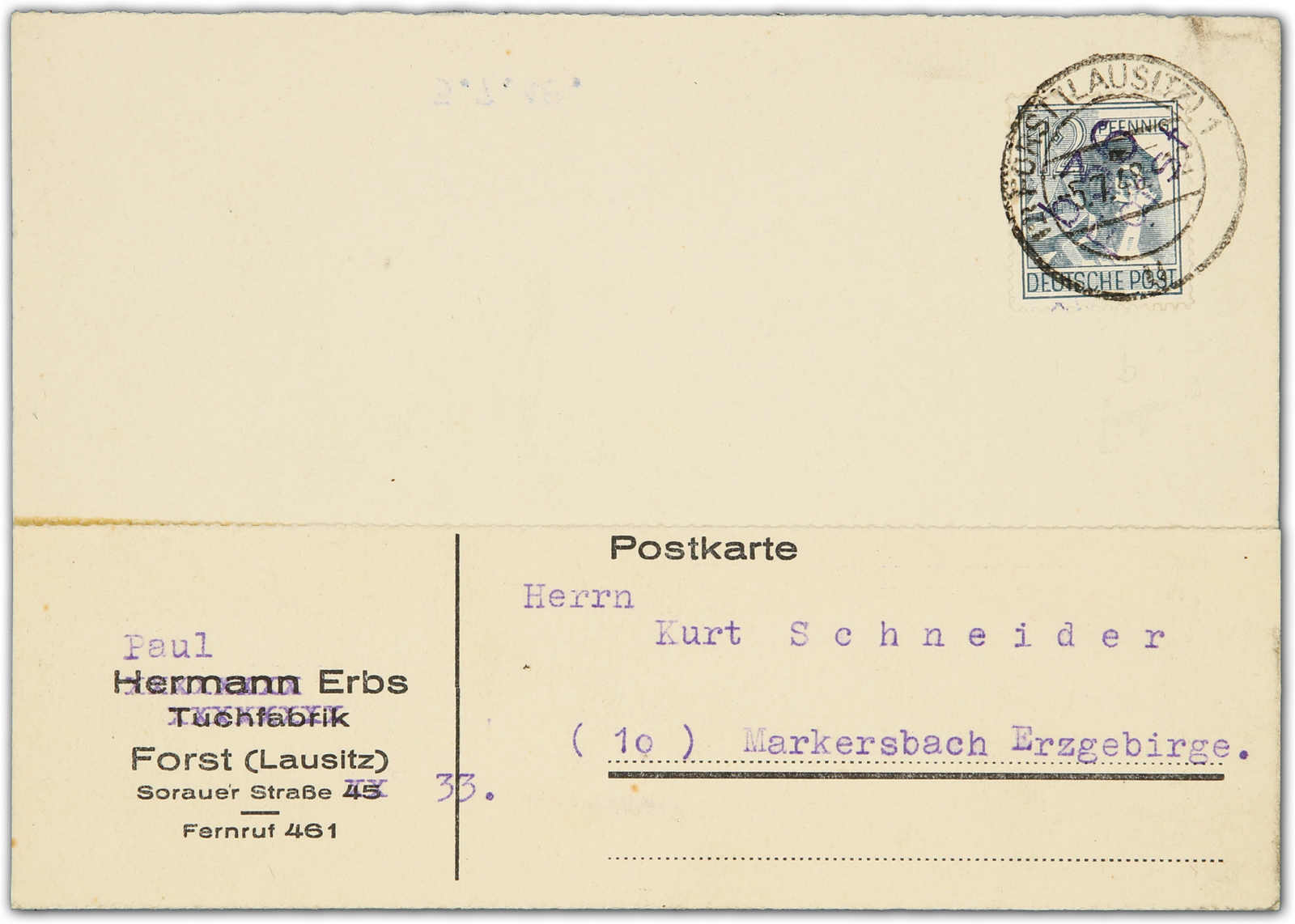 1948, 12 Pfg. Freimarke mit violettem Bezirksstempelaufdruck "36 FORST b" auf Postkarte, Stempel "FORST (LAUSITZ) 5.7.48", portogerecht und einwandfrei, die violette Aufdruckfarbe dieses Ortes ist sehr selten und auf Bedarfskarte eine