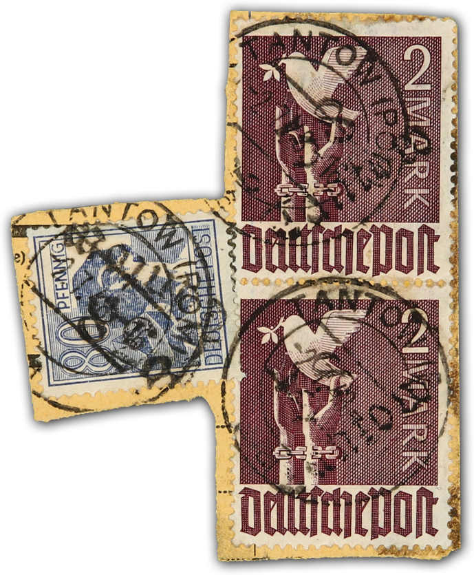 1948, 2x 2 M. Taube und 80 Pfg. Arbeiter mit Bezirkshandstempel-Aufdruck "38 Tantow" auf Briefstück, einwandfrei, geprüft Ballschmidt BPP