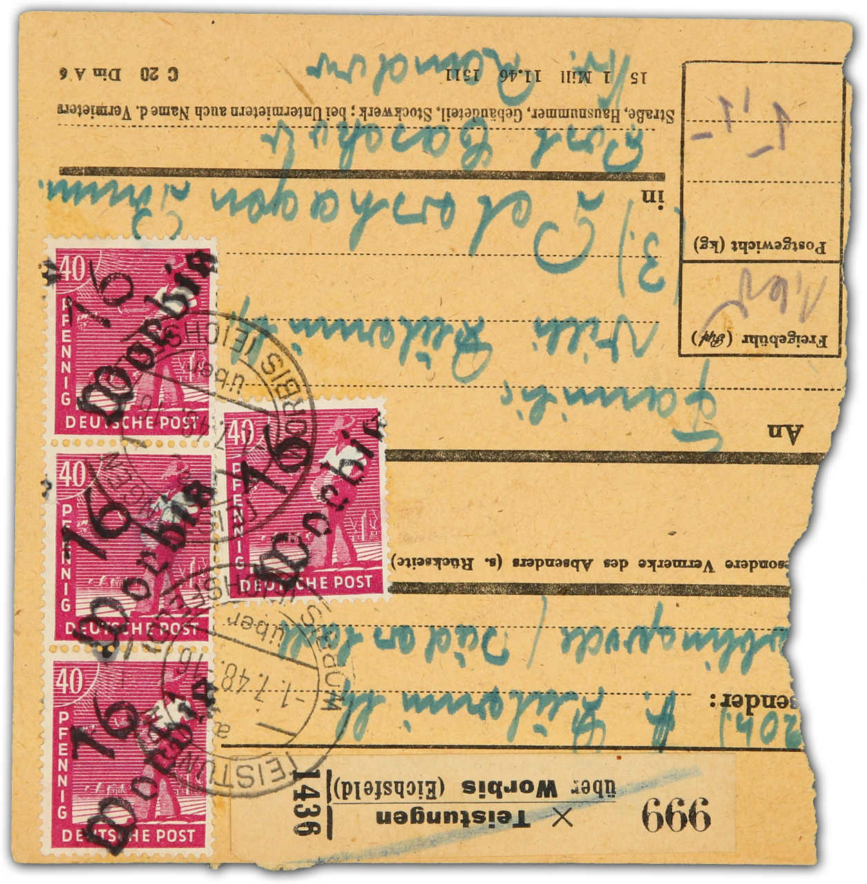 1948, 40 Pfg. Arbeiter lila mit Handstempelaufdruck „Worbis“ per 4 Stück als reine Mehrfachfrankatur auf Paketkartenabschnitt von Teistungen über Worbis nach Petershagen Post Casekow, gute Qualität, signiert Schmidt VPEX (Image) (imagea)